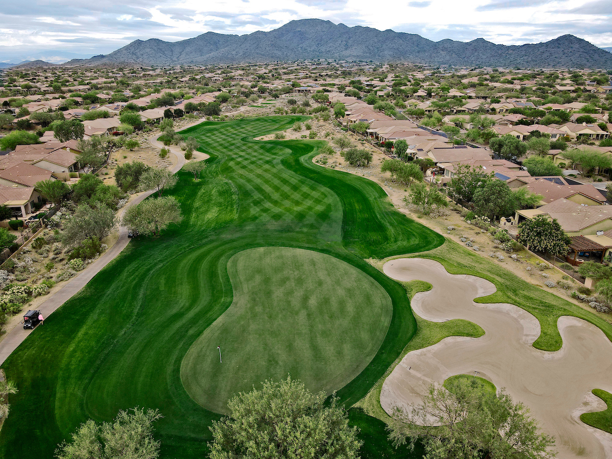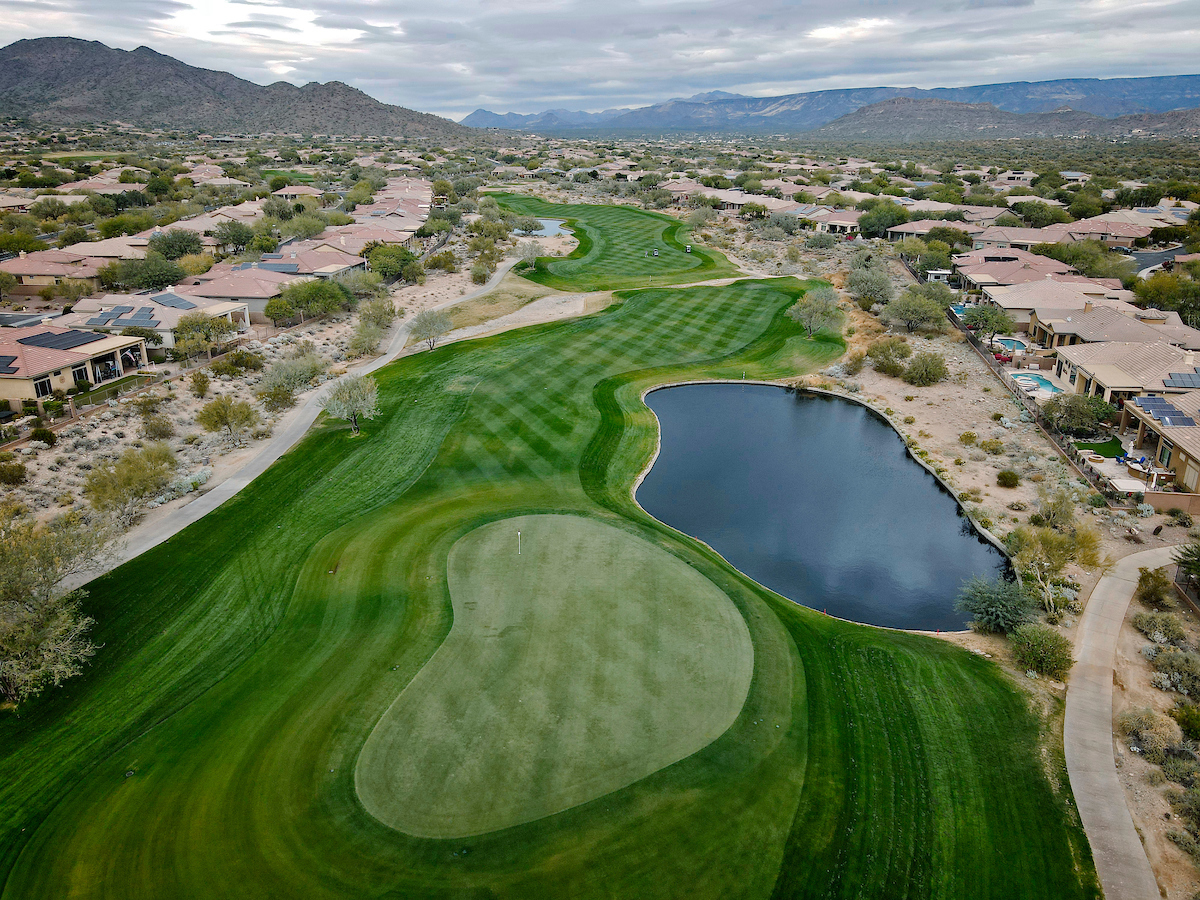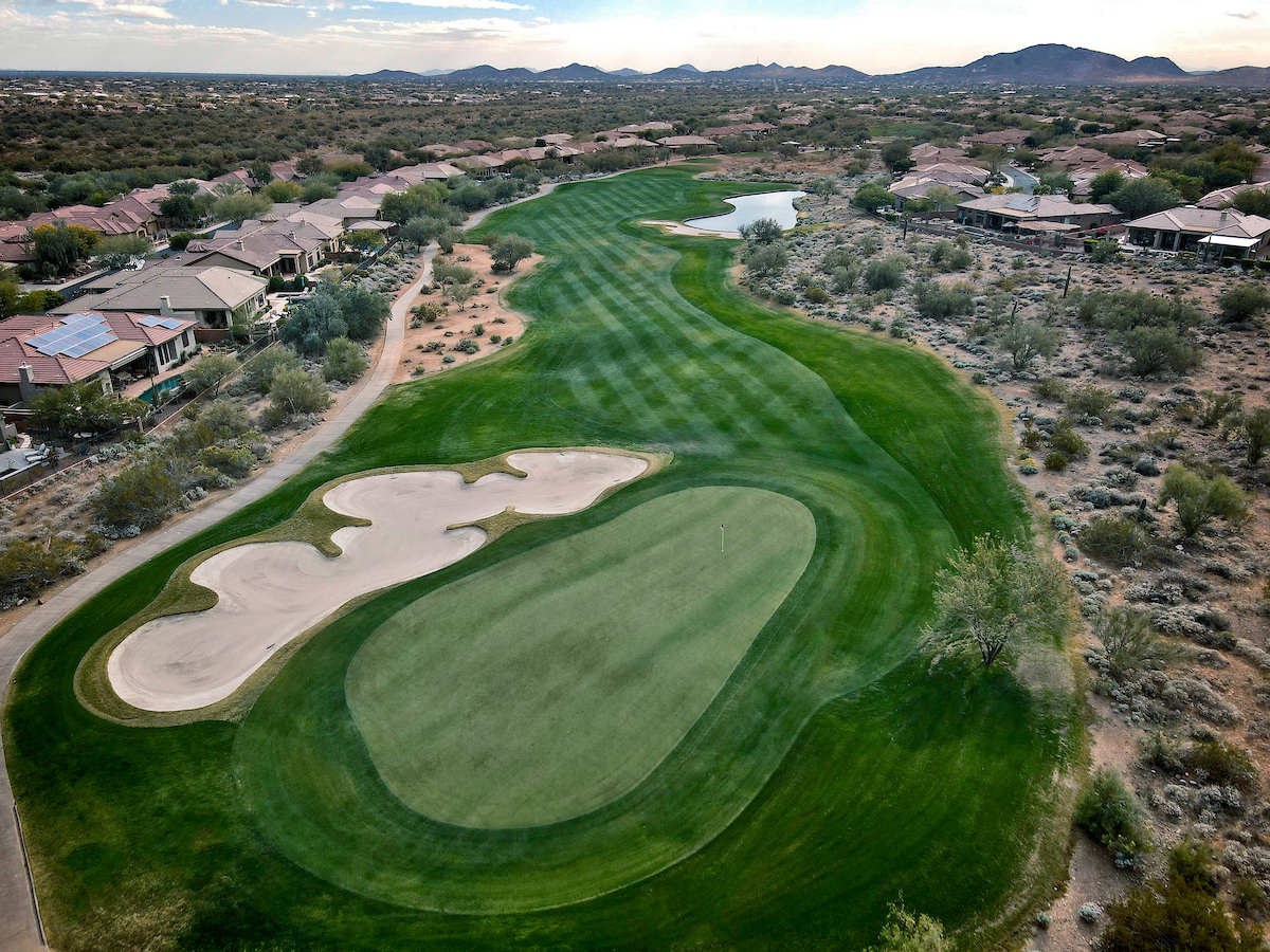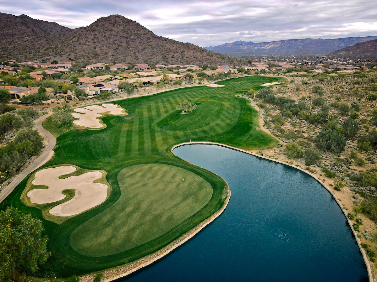 The Ironwood Course, which opened in January 2004 as a Phoenix private golf course, encompasses seven water features, intimidating bunkers, and a backdrop of a mountain mesa. This is a classic high-risk/high-reward design and the more challenging of the two Anthem, Arizona golf courses. Post-round conversation often focuses on “Anthem Alley,” the 10th through 12th uniquely crafted water holes that tend to drive up scores.