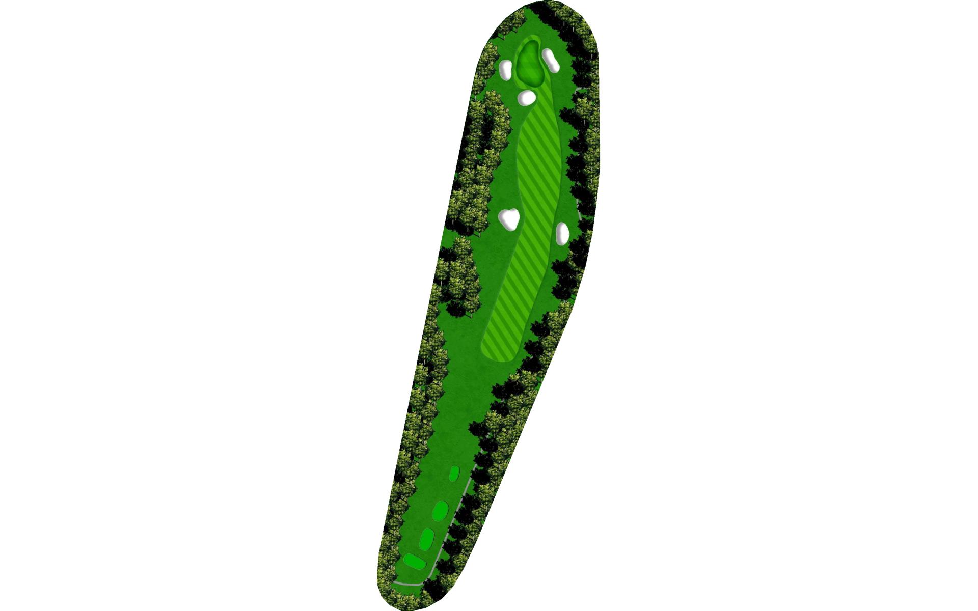 A short par 4 that requires an accurate tee shot of 180 to 200 yards. The approach shot is most critical, with a two-tier green and a pond short of the green.