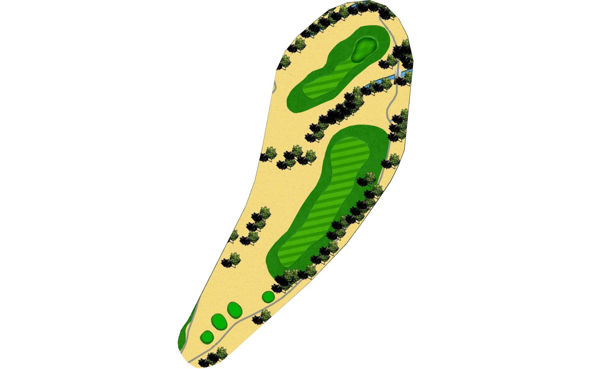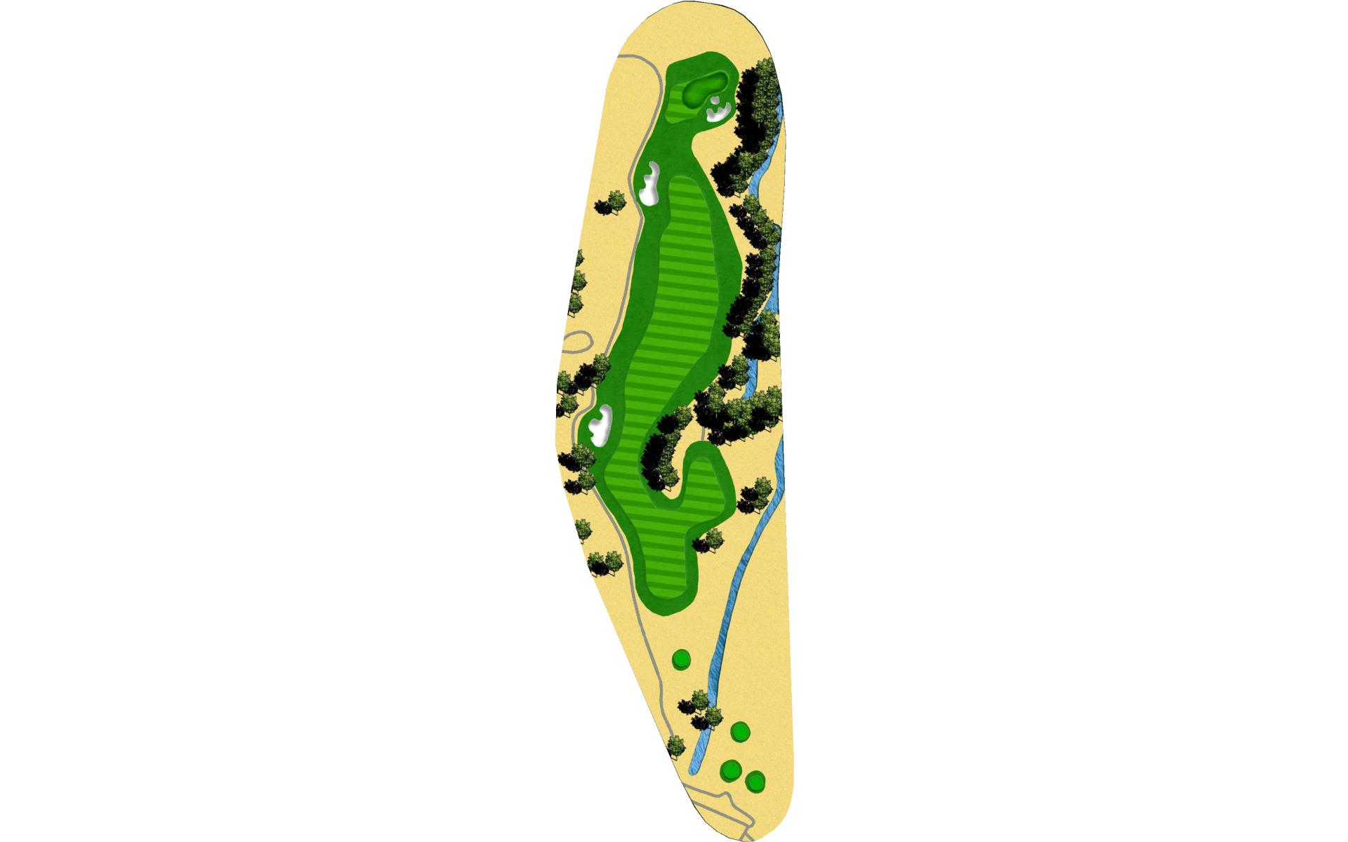 The twelfth features a split fairway and requires an accurate tee shot. Favoring the right is the safe play, but longer hitters can try the left. On the approach, most players will want to take an extra club to hit this elevated, two-tiered green.