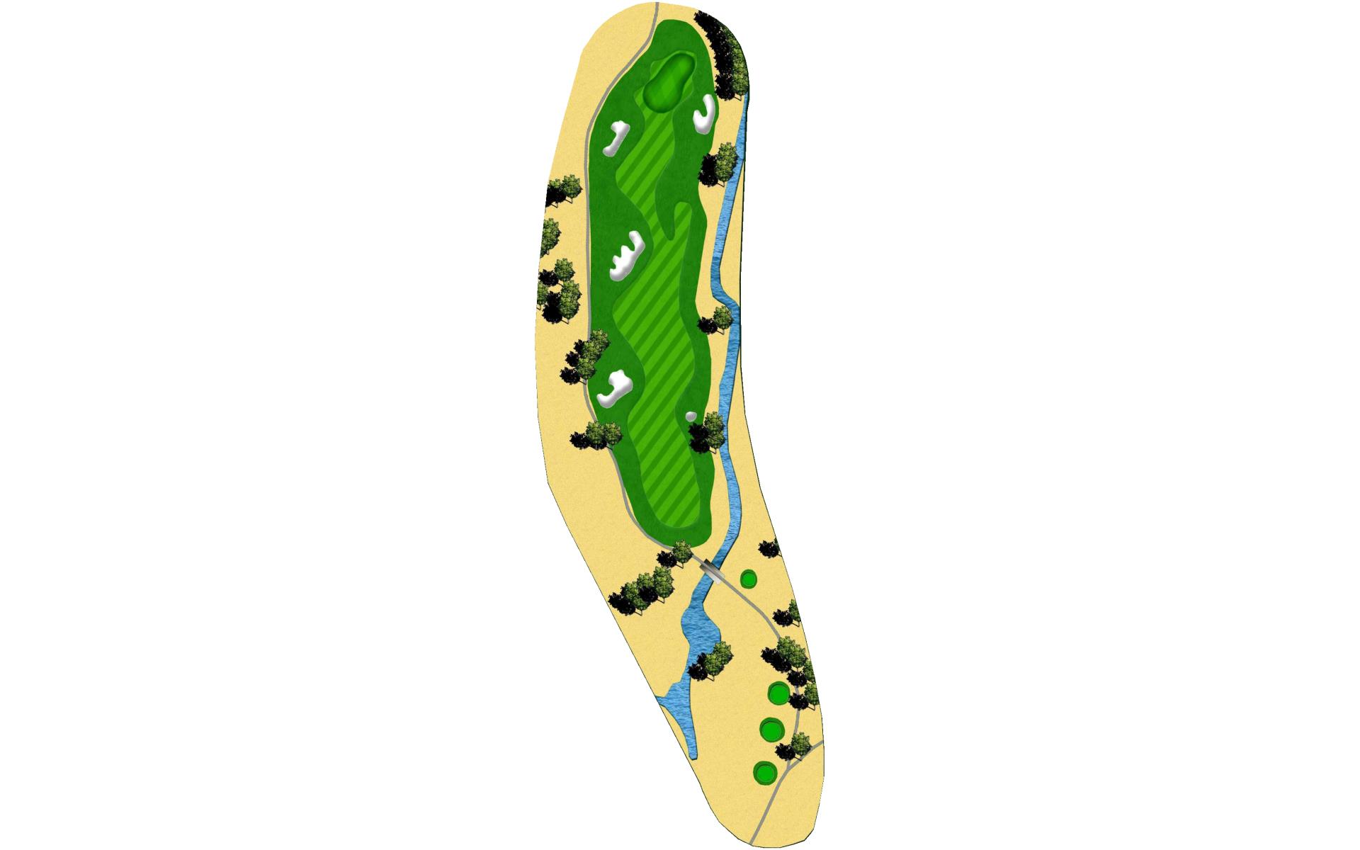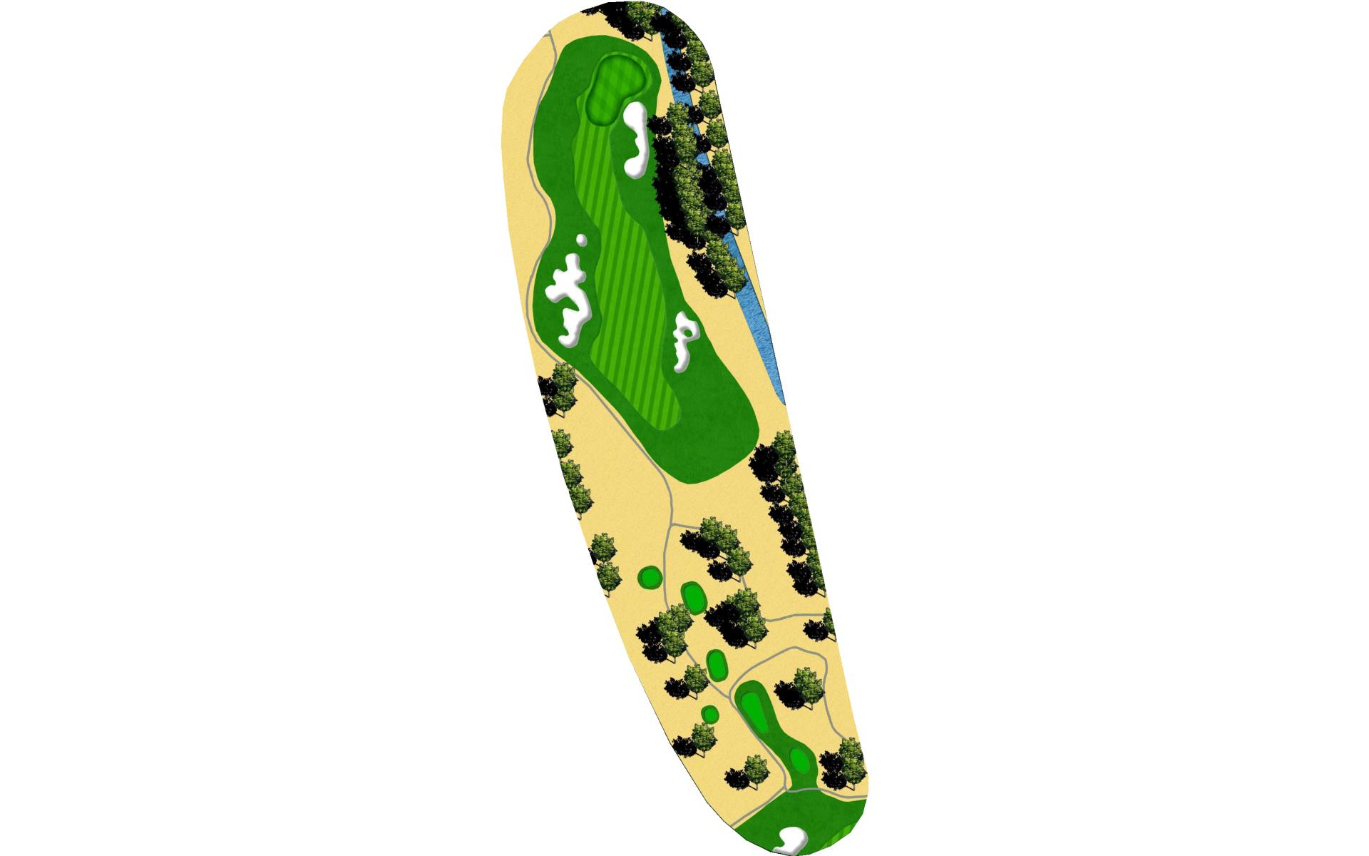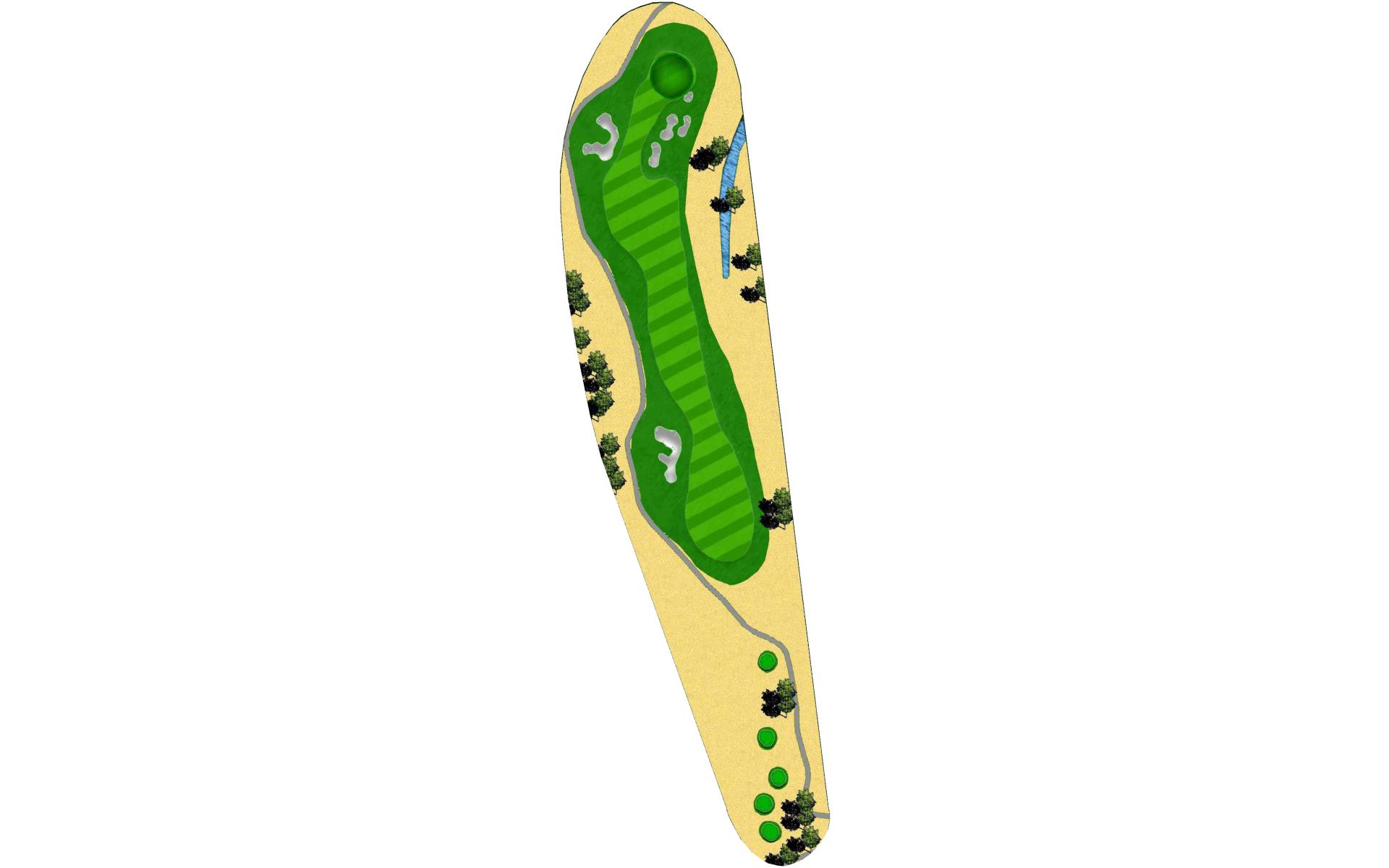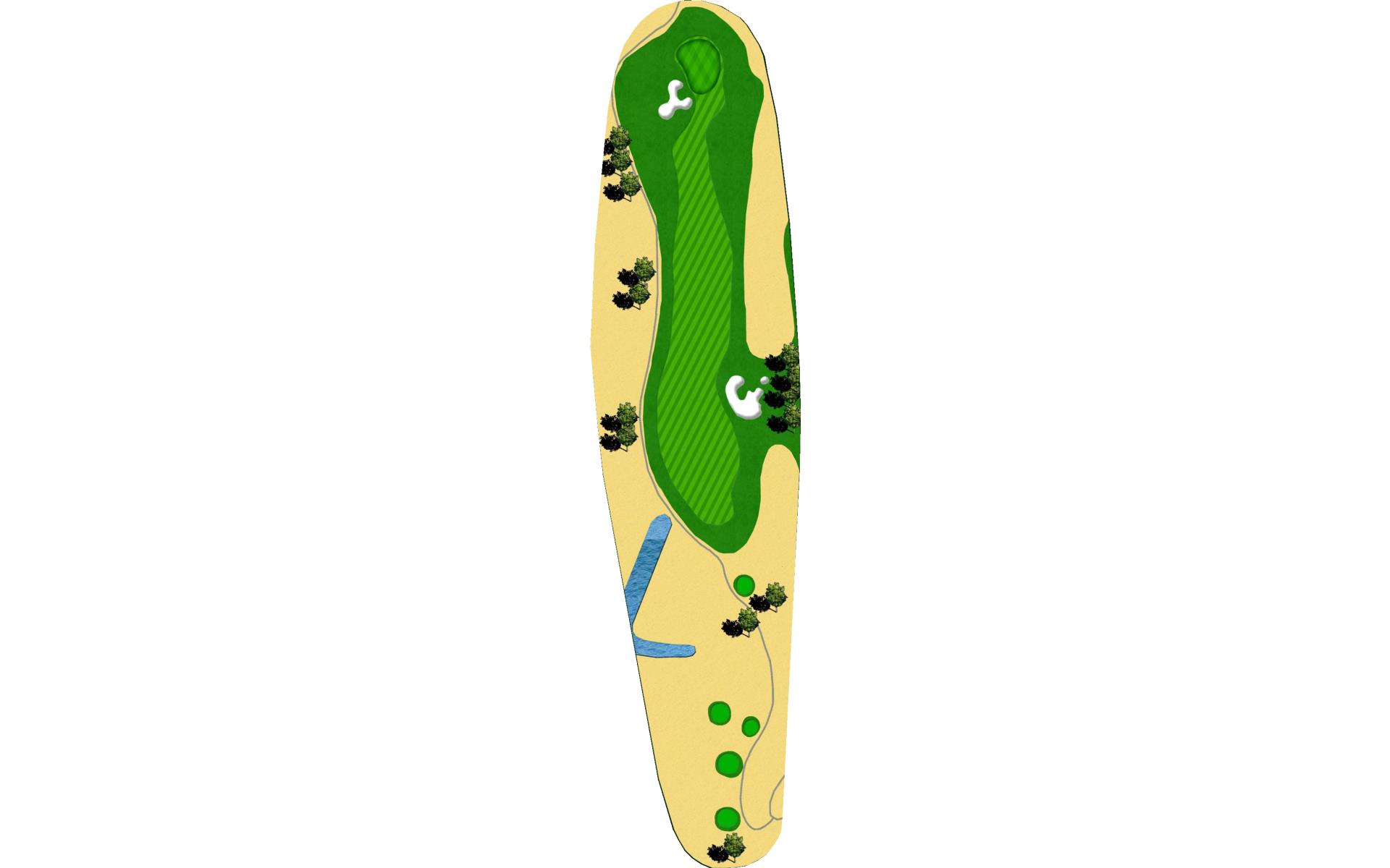 A tee shot down the right is the best play off this severe dogleg left par 4. A deep grass bunker awaits shots that try to cut the corner. An accurate iron shot is required to hit this back-to-front sloping green.