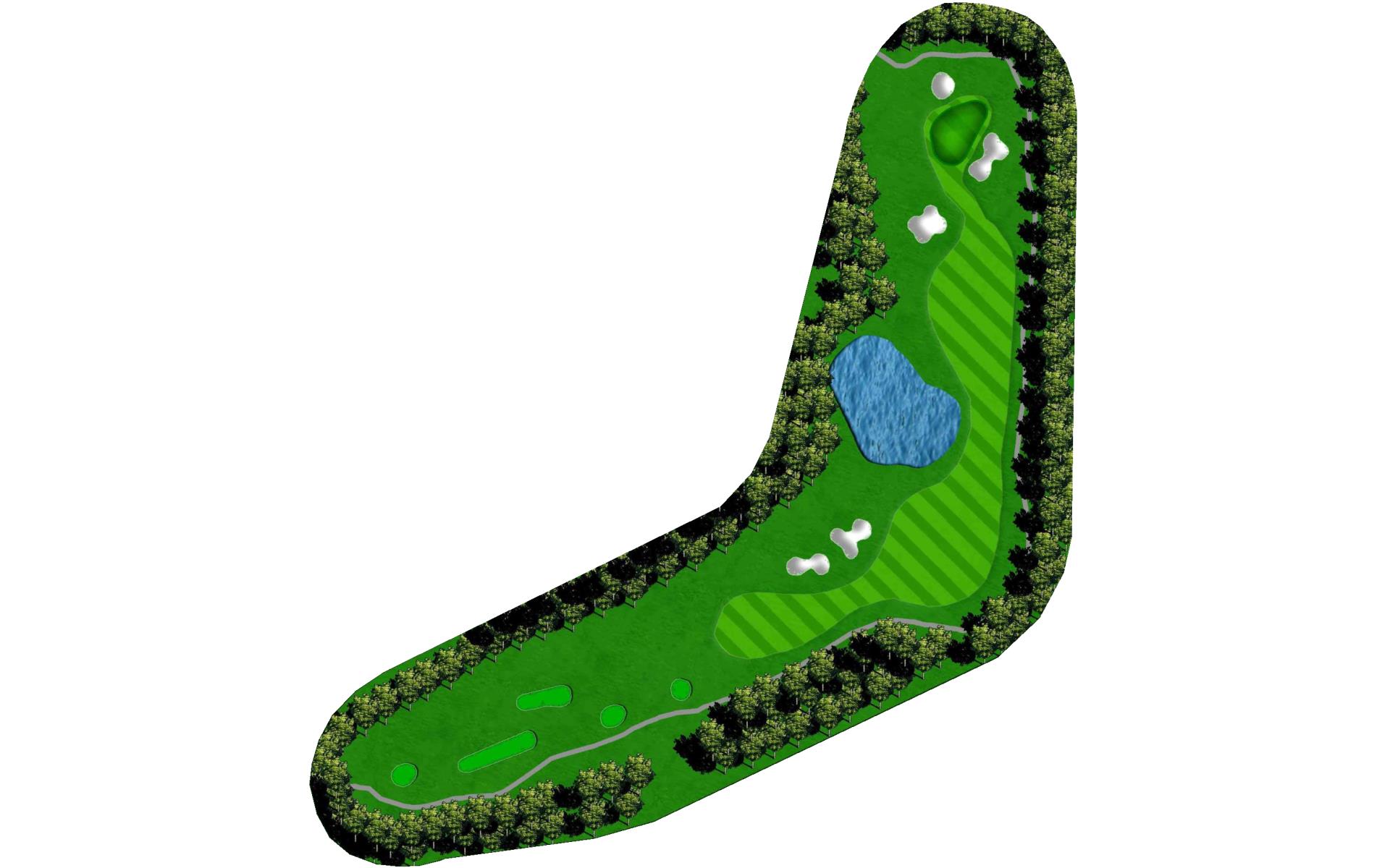 This dogleg left par 4 requires a tee shot, from the black tees, of about 200 yards and favoring the right side. The approach shot travels over a green to a green with two bunkers on the left side.