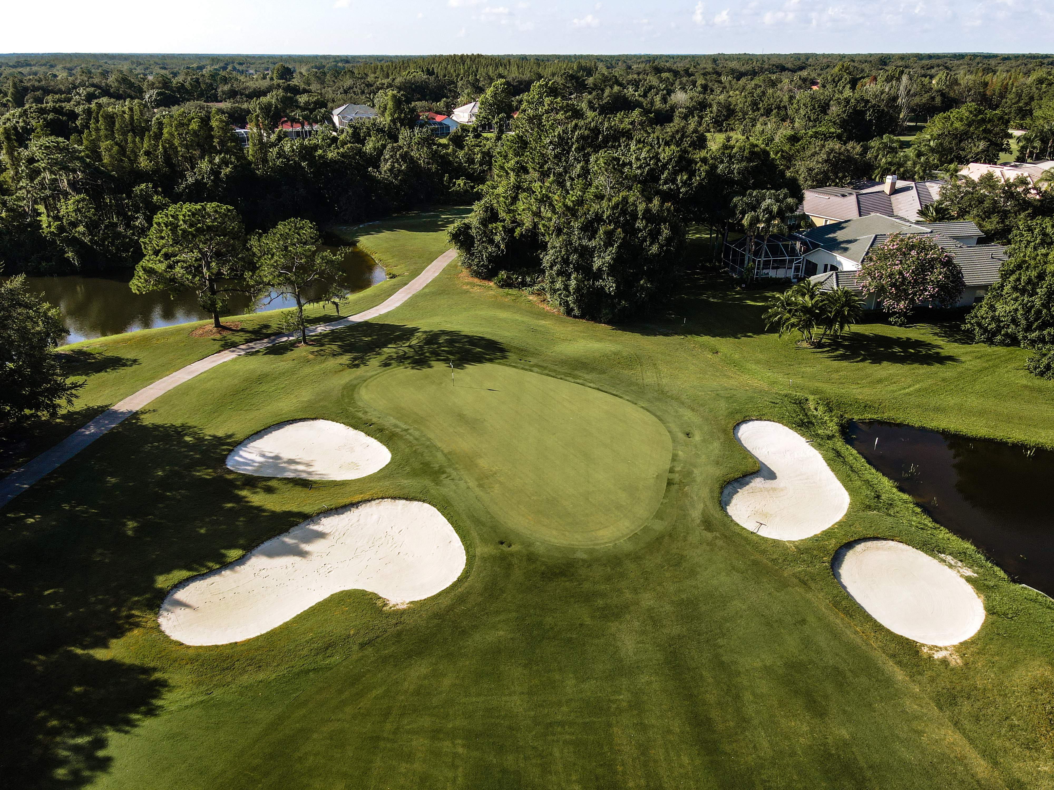 The No. 1 handicap hole for a reason. The tee shot requires precision and narrows right at 270; choose a short tee shot if you are not comfortable hitting the narrowing fairway. The green is tucked back right along the wetlands requiring a long- to mid-iron shot into the green that slopes left to right toward the hazard.