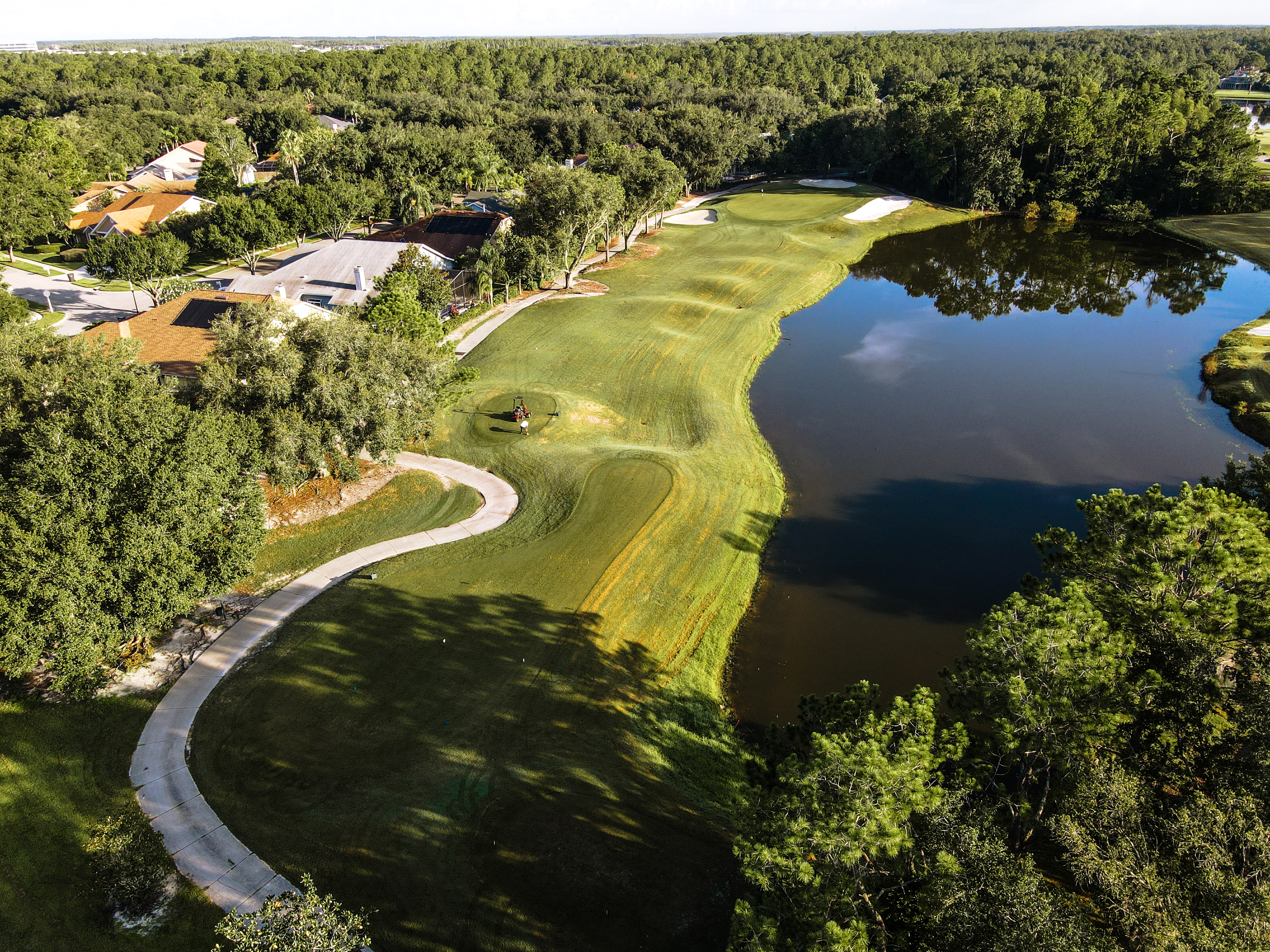 Another challenging par 3 that plays slightly less than it looks, with water along the entire right side. The green slopes severely left to right requiring you to land the ball below the hole if you want to take advantage of a good shot