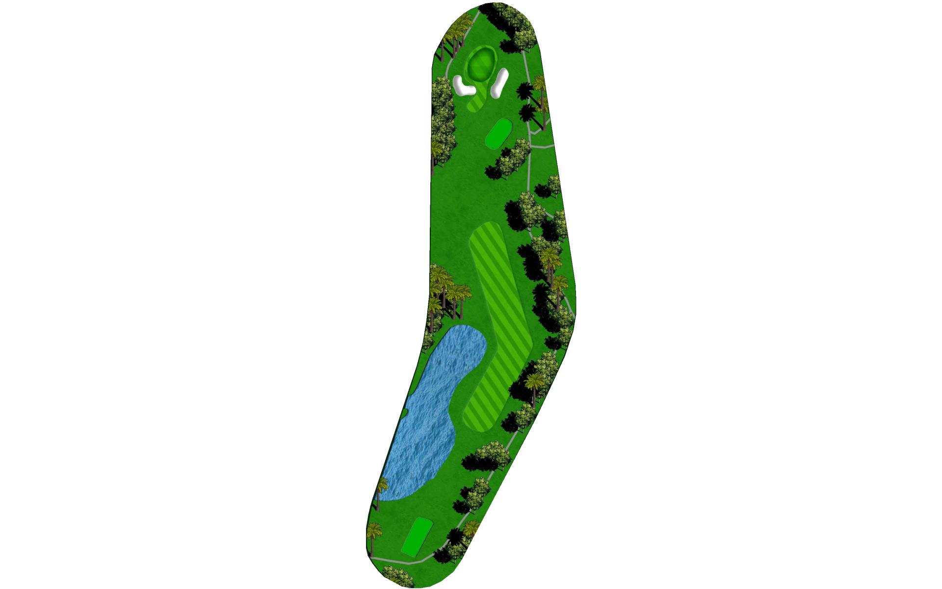 Tee shot favors right to left ball flight on this short par 4, water is in play for longer tee shots. Green is sloped back to front with bunkers on both sides making this a hole that requires more thought than most.