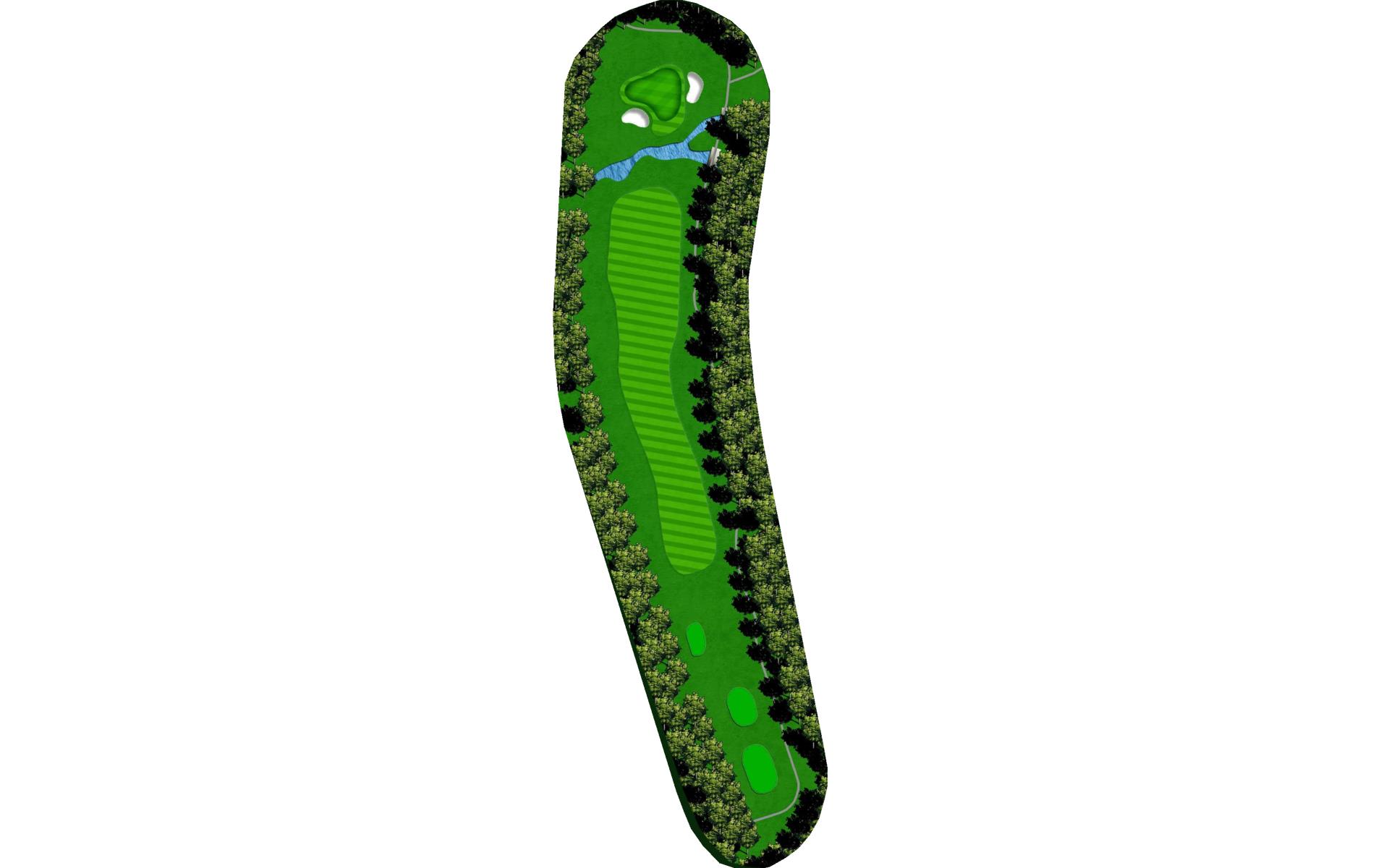 | The longest hole on the course is extremely difficult to reach in two shots because of the pond guarding the green. The smart play is to lay up short of the pond. |
