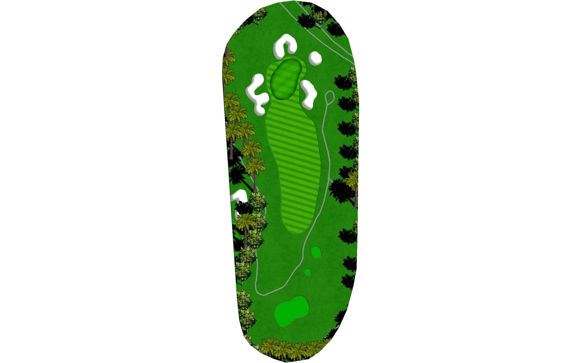 This severe dogleg left can be shortened if you dare to hit a driver over the towering palms on the left. If not, a 3 wood with a slight draw will leave you with a mid- to long iron into this back-to-front sloping green. Below the hole is a must.