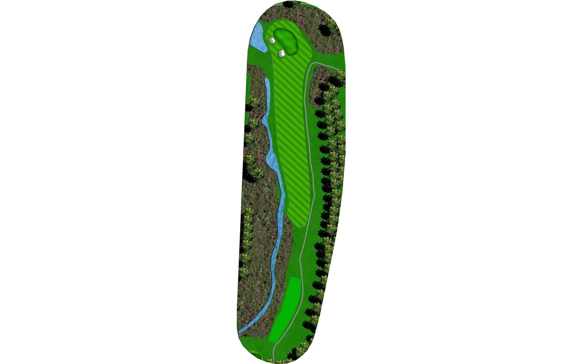 Tee shot through a narrow shoot. Golf balls hit on the left side of the fairway typically will bounce right. The green is narrow and protected by water on the front and a bunker all along the back side.
