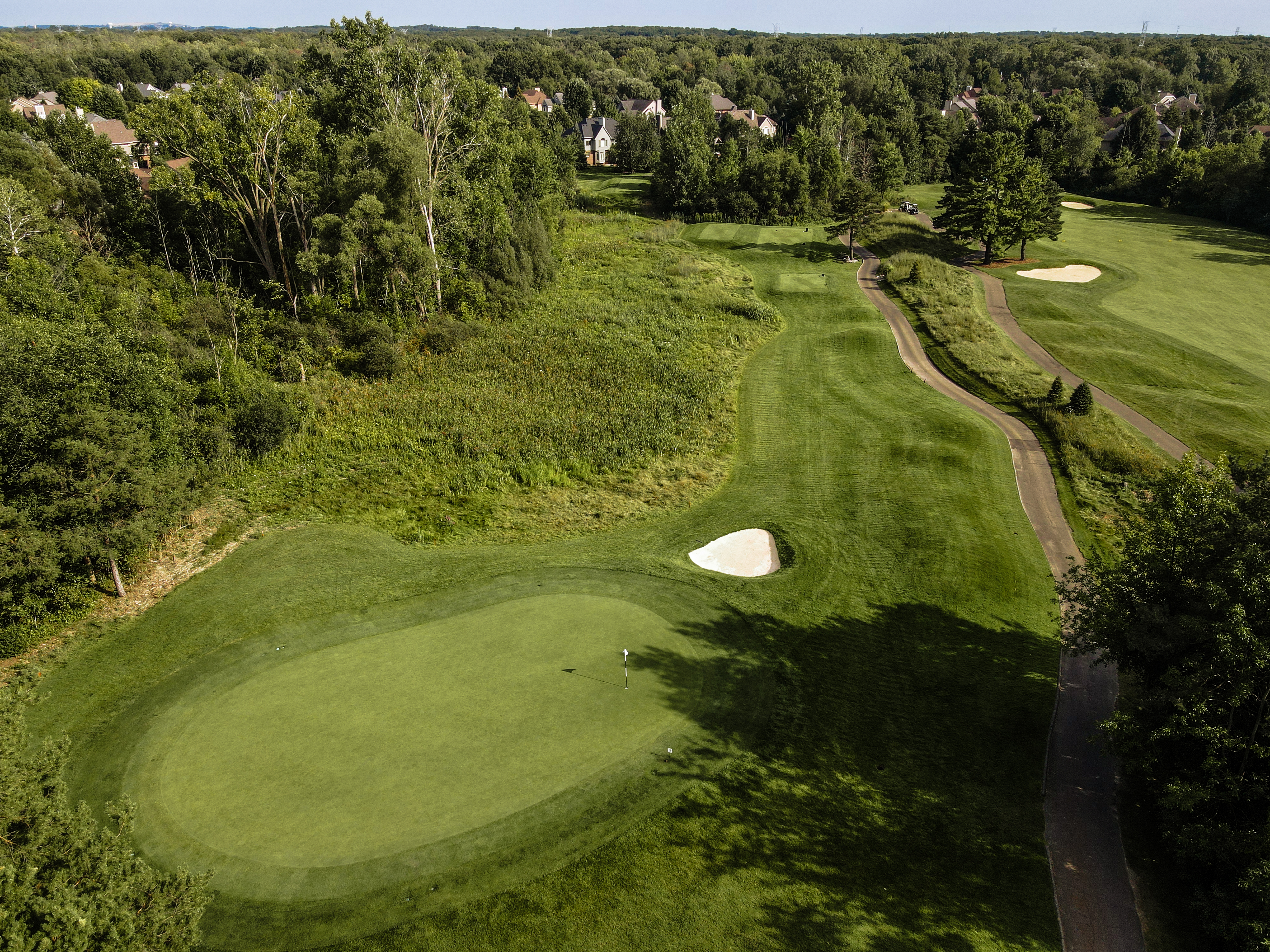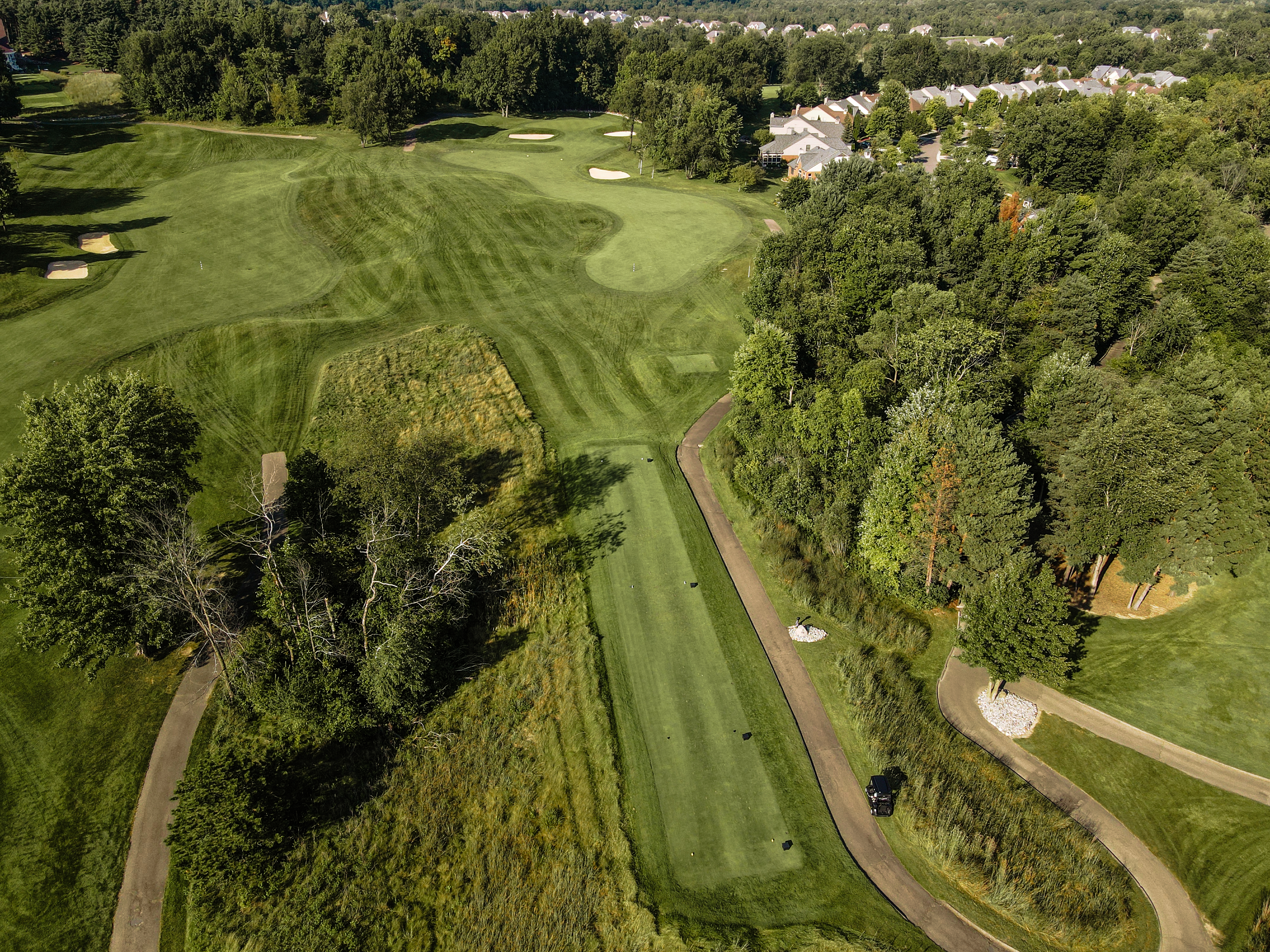 The gap between the last tree on the left and the wide sand bunker in the center of the hole begs for a 210-yard carry to the 150-yard stake, leaving a second shot over a deep, hidden grass bunker and a deep pot sand bunker on the right front corner of this small, right to left sloping green. A long carry straight ahead will put you perfectly placed with a 150-yard straight carry into the flag. A large landing area sits behind and left of the green.