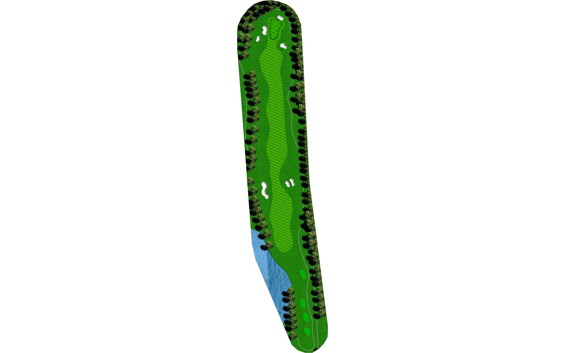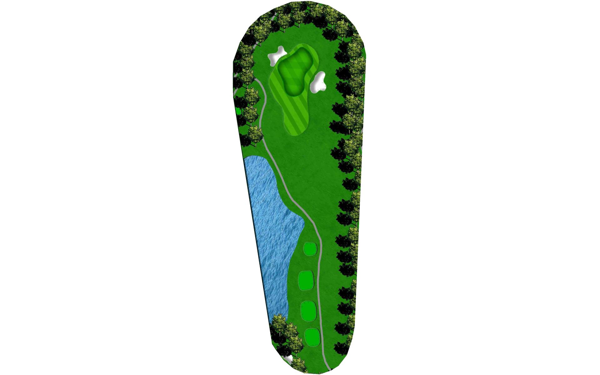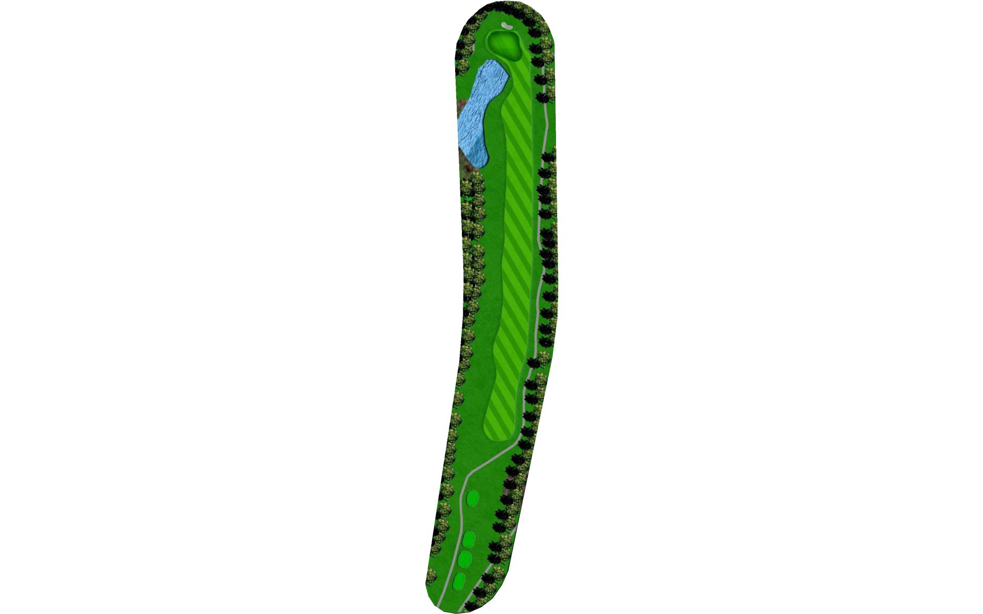 Long hitters can cut off part of the lake’s corner. Keep in mind the wind blows towards the water. Keep ball short of all pin positions.