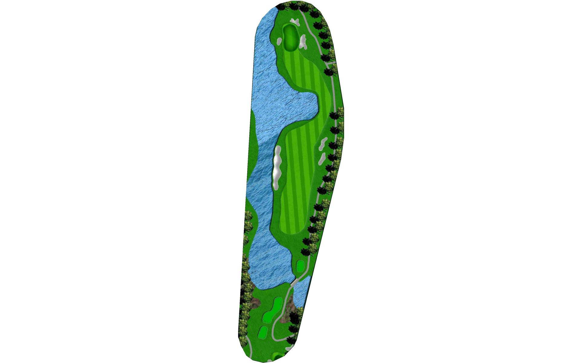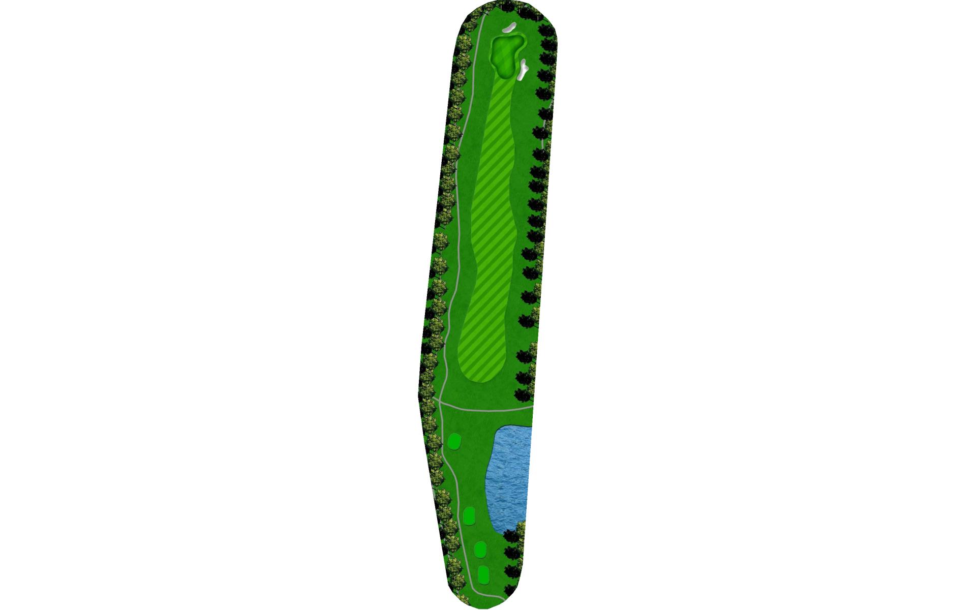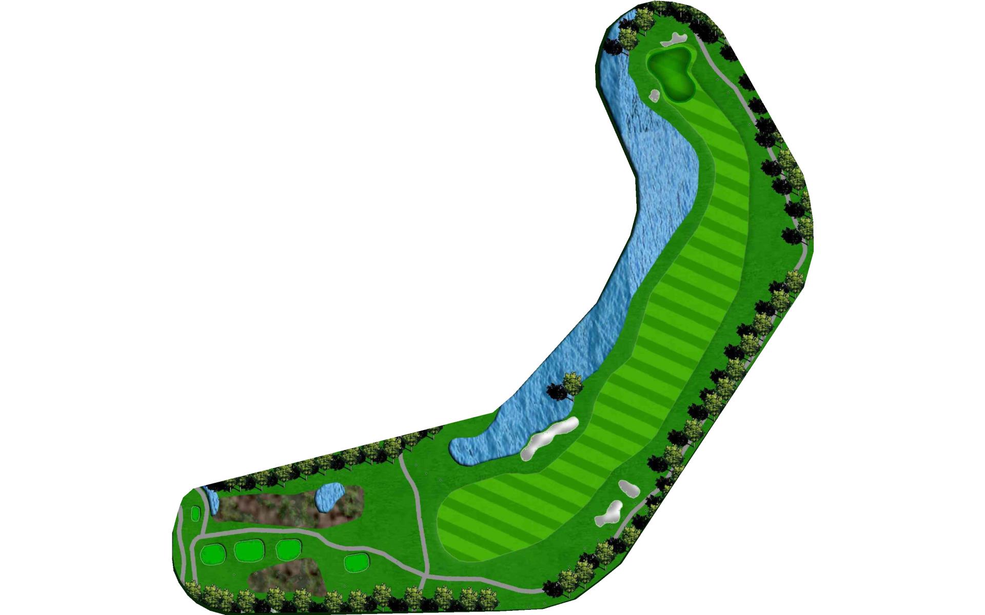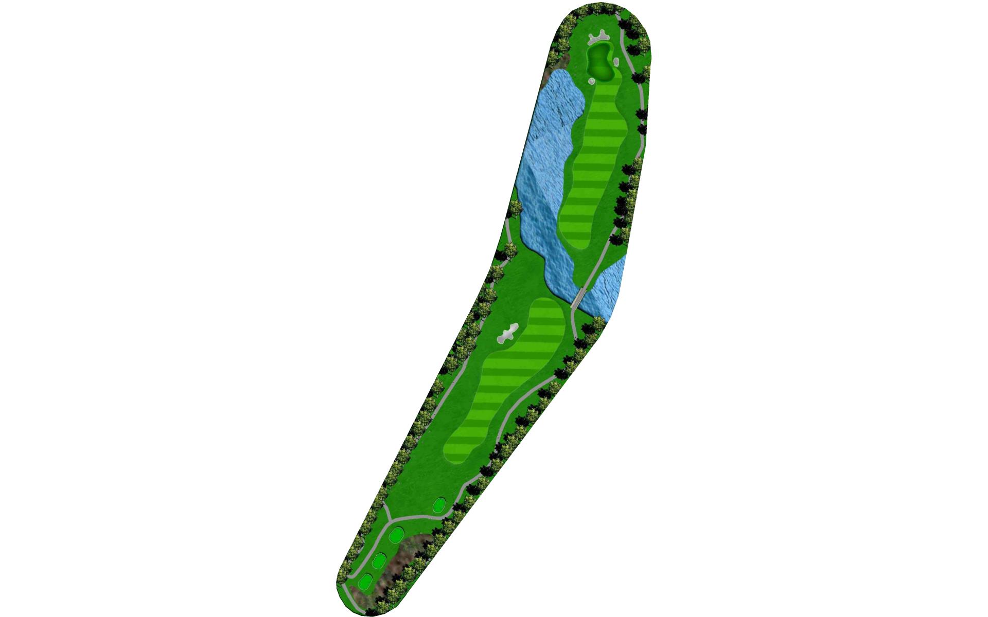 Long hitters can cut off part of the lake’s corner. Keep in mind the wind blows towards the water. Keep ball short of all pin positions.
