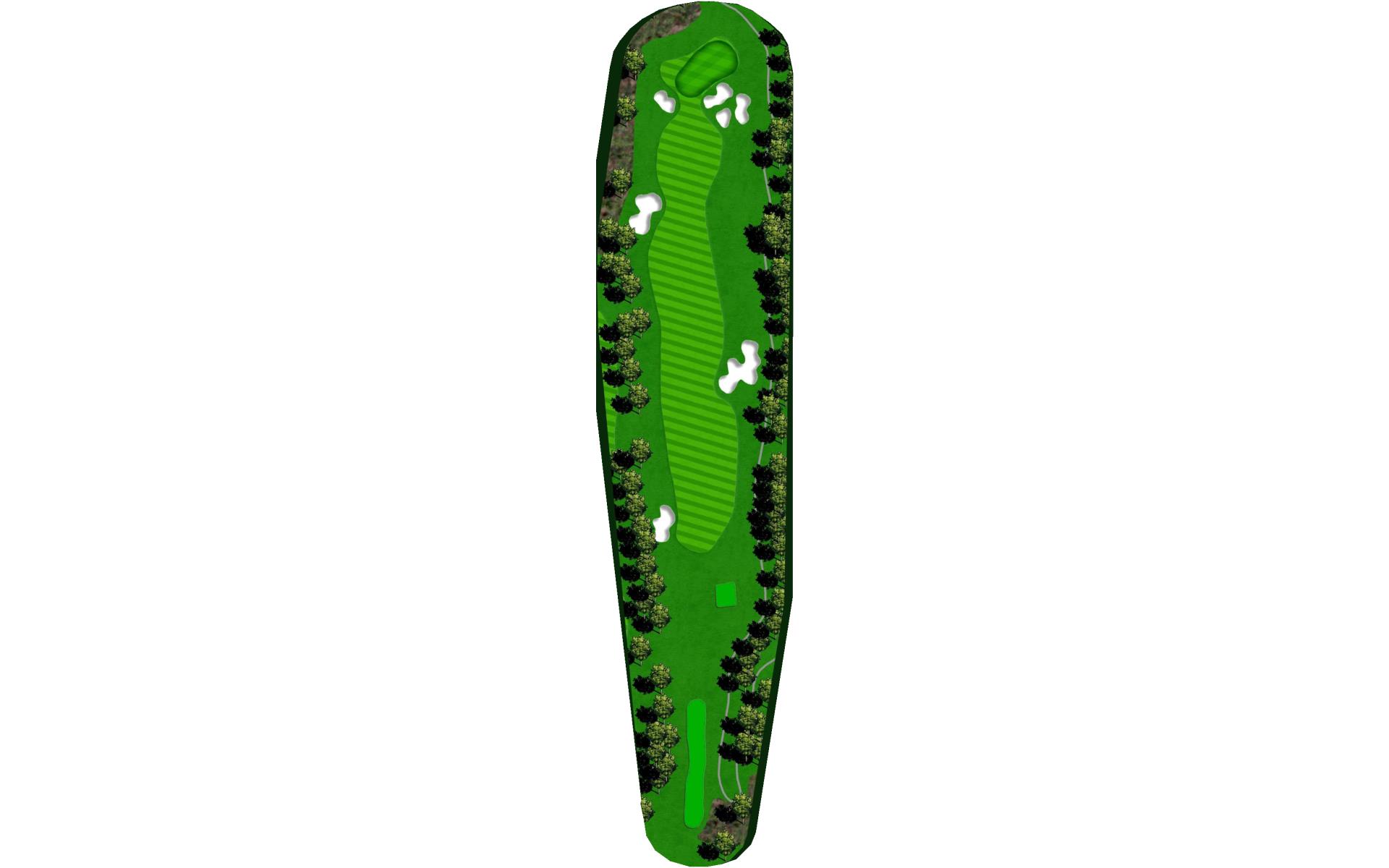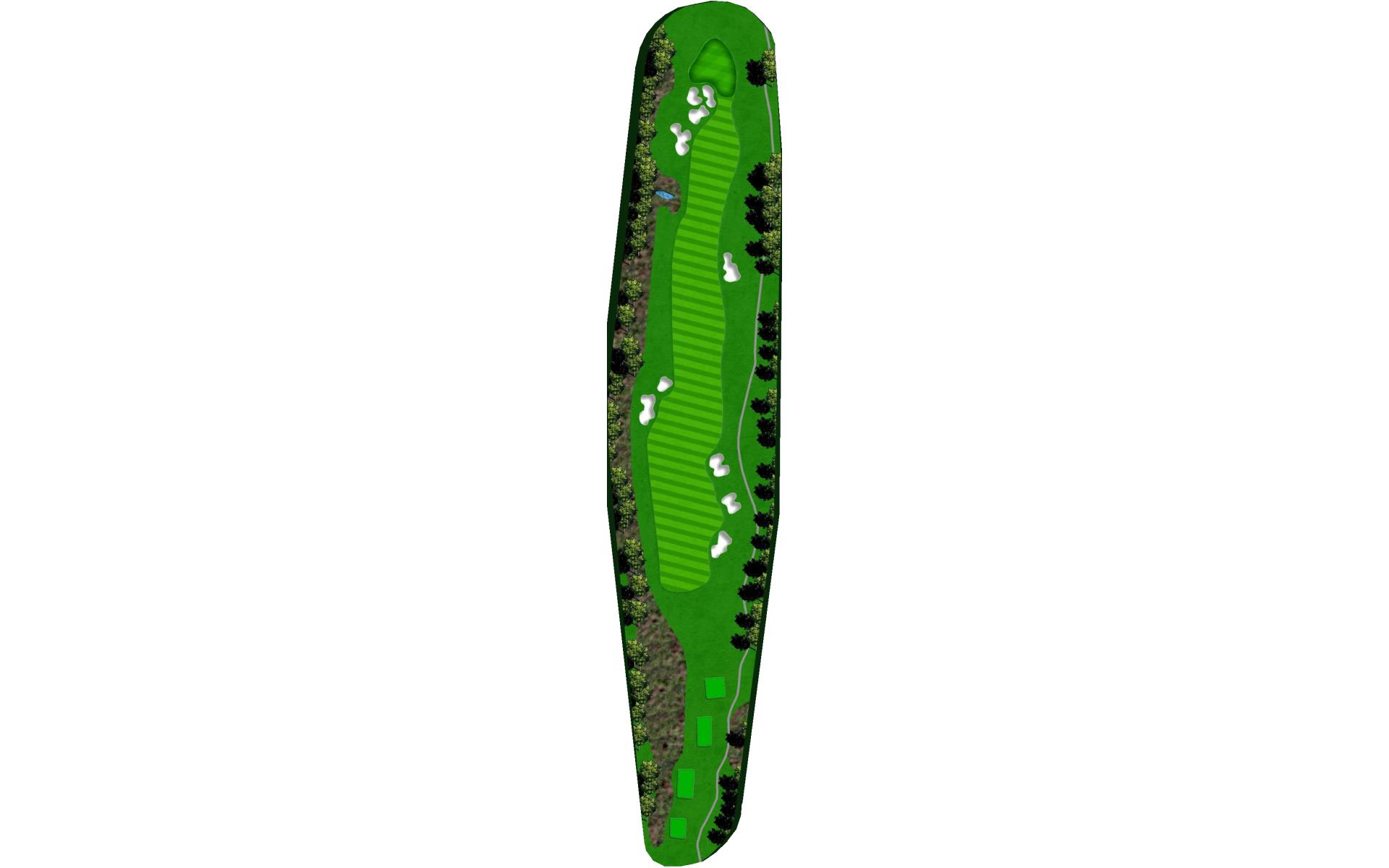 A slight dogleg right. Long hitters can try and challenge the bunker on the right for a shorter approach shot. The green has a false front and slopes from right to left as well as back to front. This challenging hole will test the best iron players because any shot into the green that lands on the left side of the green will roll off into the collection area.