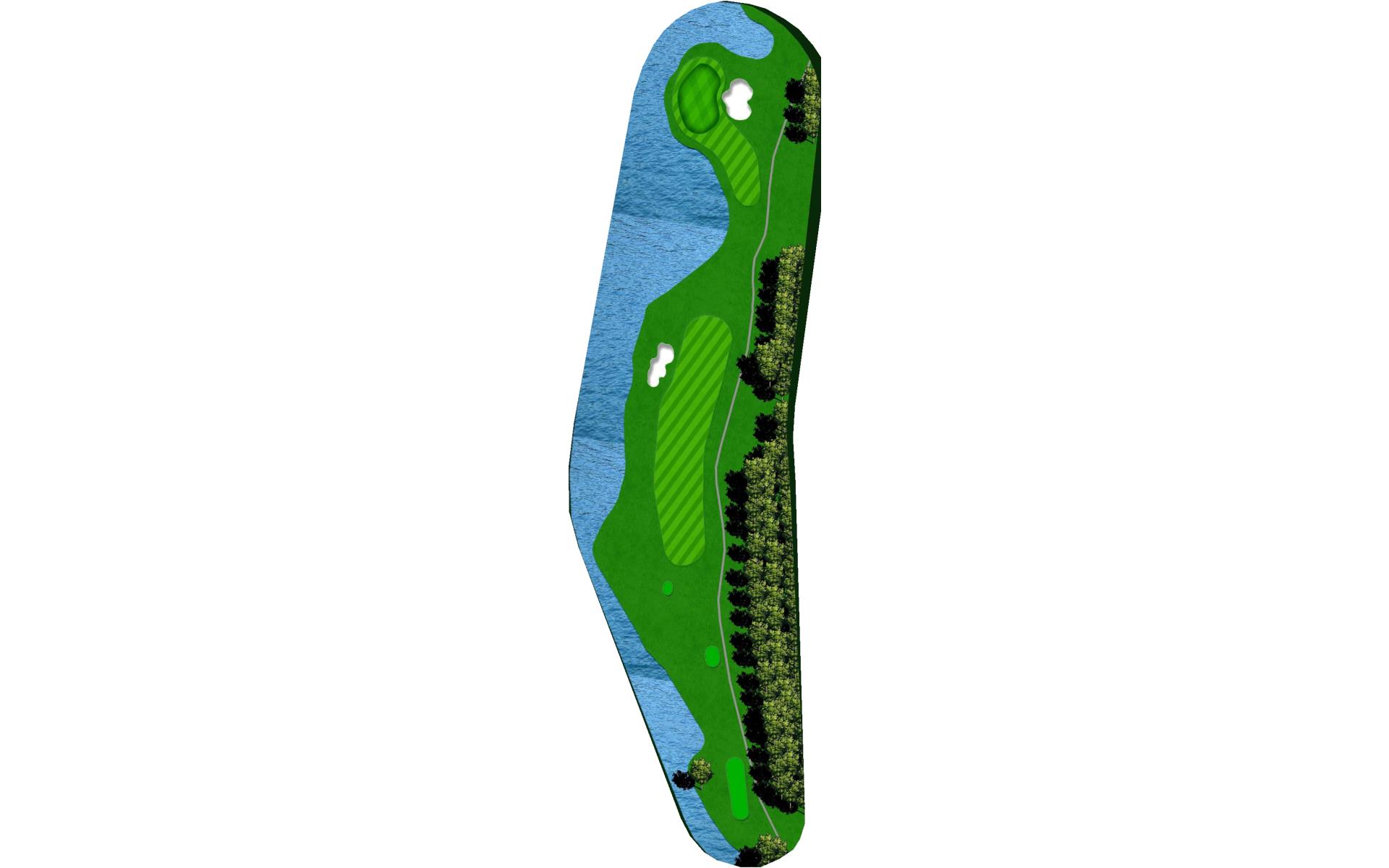 Downhill dogleg right with a welcoming view of the back nine lake holes. The downhill approach takes flight to a large forgiving green.