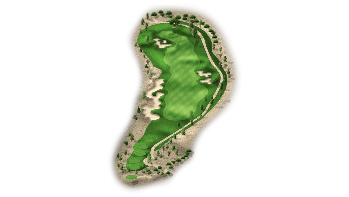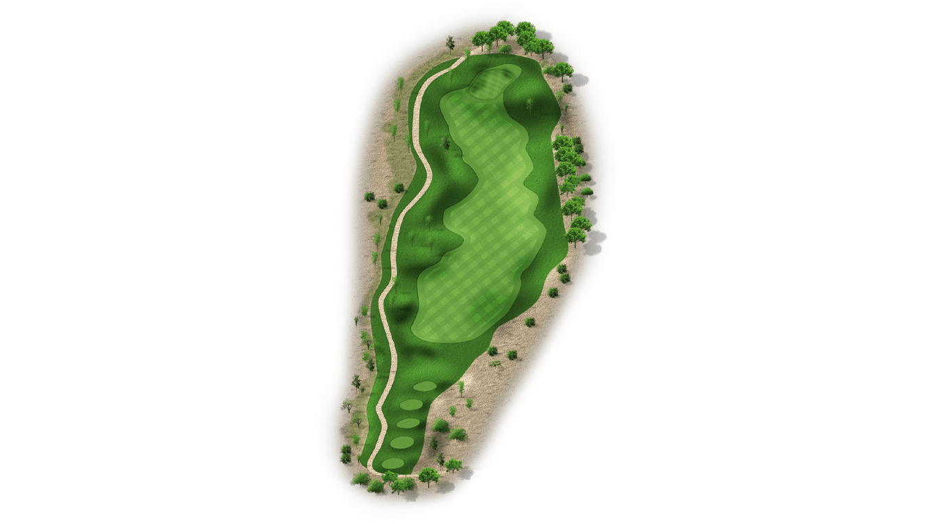 | The eighth is the longest par 3 on the golf course. It features a difficult two-tiered green and bunkers on the left side. Aim for the center of the green because par is a great score. |