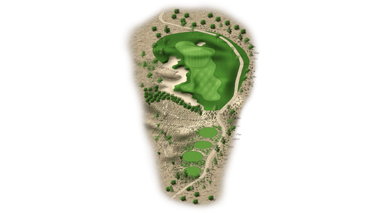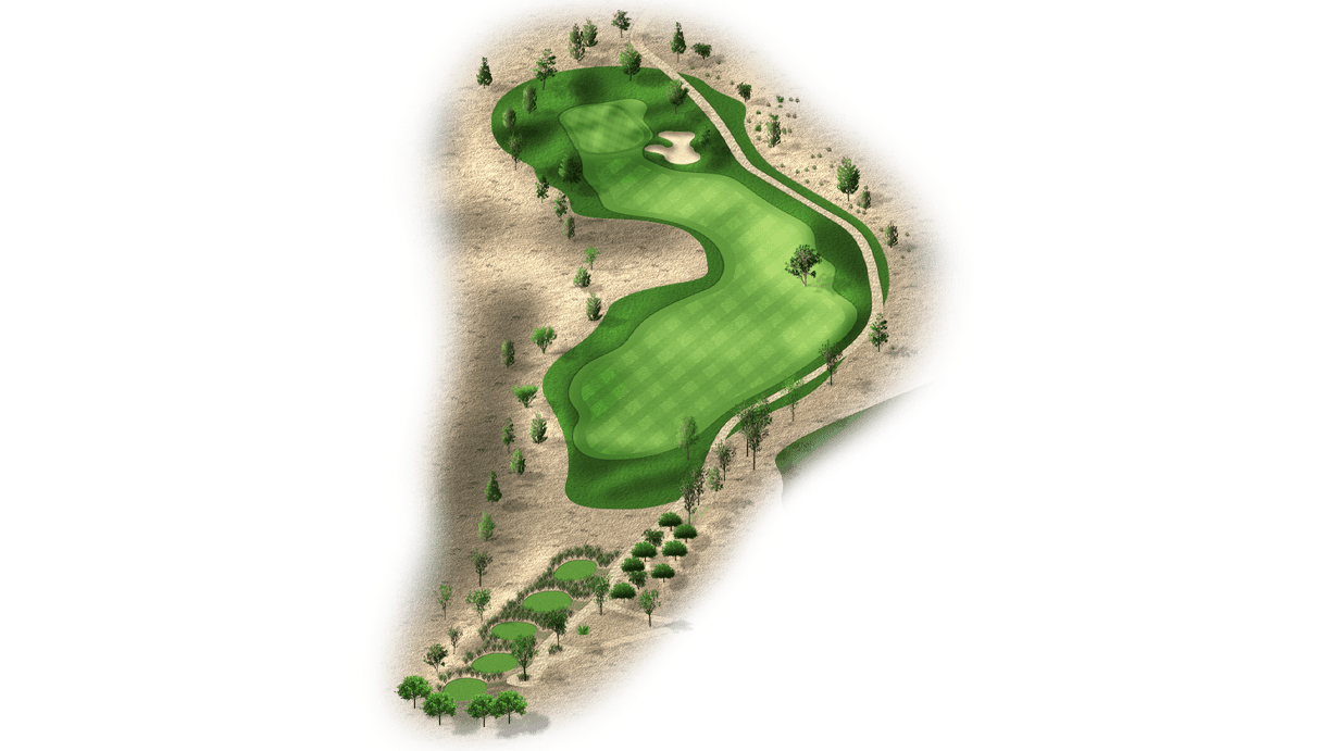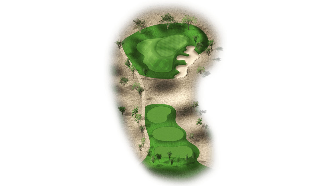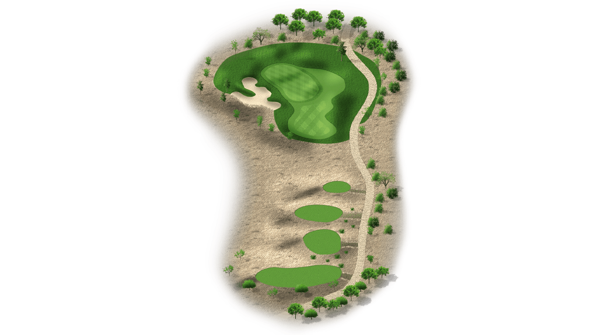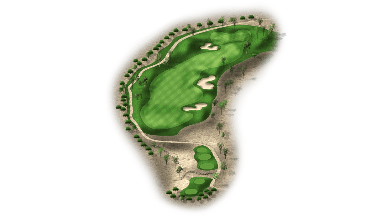 | The fourth hole is the first par 3 on the golf course. Most players will have a mid-to-long iron into this two-tiered green. It’s fairly open, with the exception of a bunker front-left and a desert left of the green. Tee shots that land in the middle of the green will set up a good chance at par. |