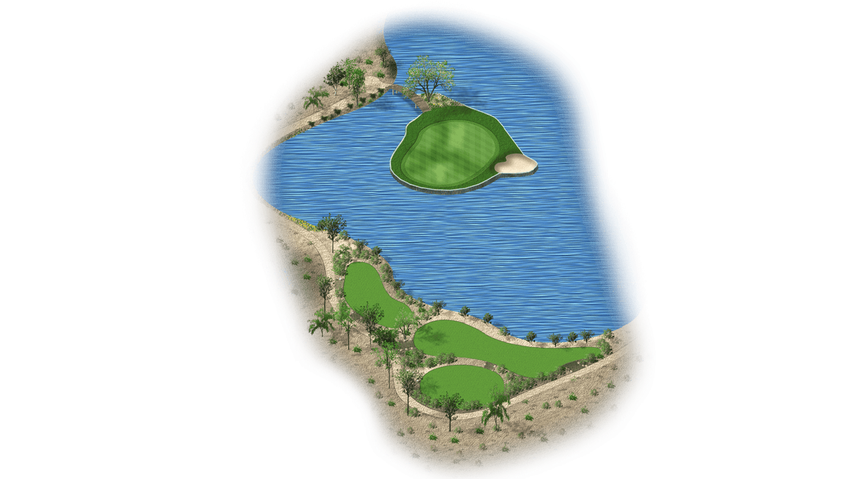 | This risk-reward hole is a drivable par 4 that’s protected by water on the right side. Players who lay-up will have a wedge into the green and will only have to avoid the bunker on the left side of the fairway. The green itself is also protected by bunkers on the right side. |