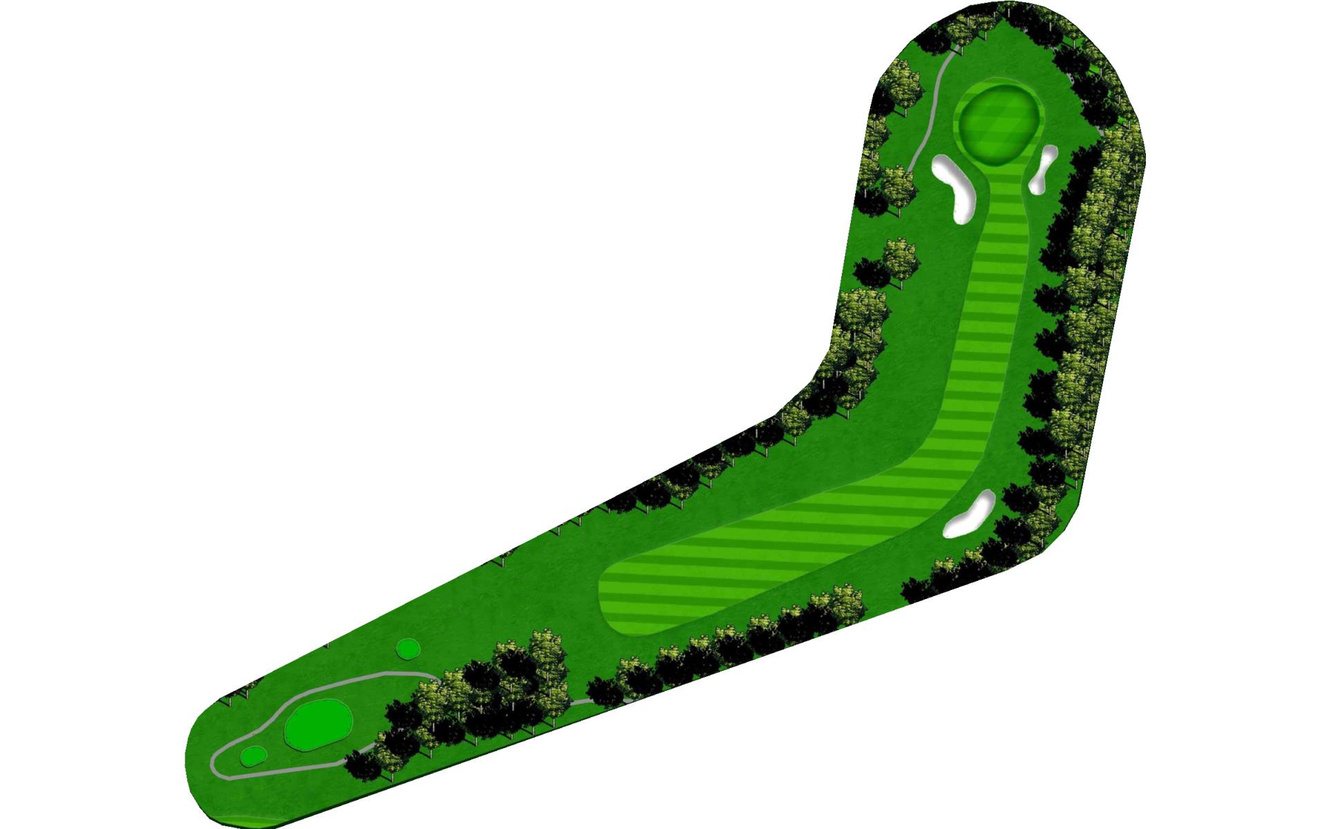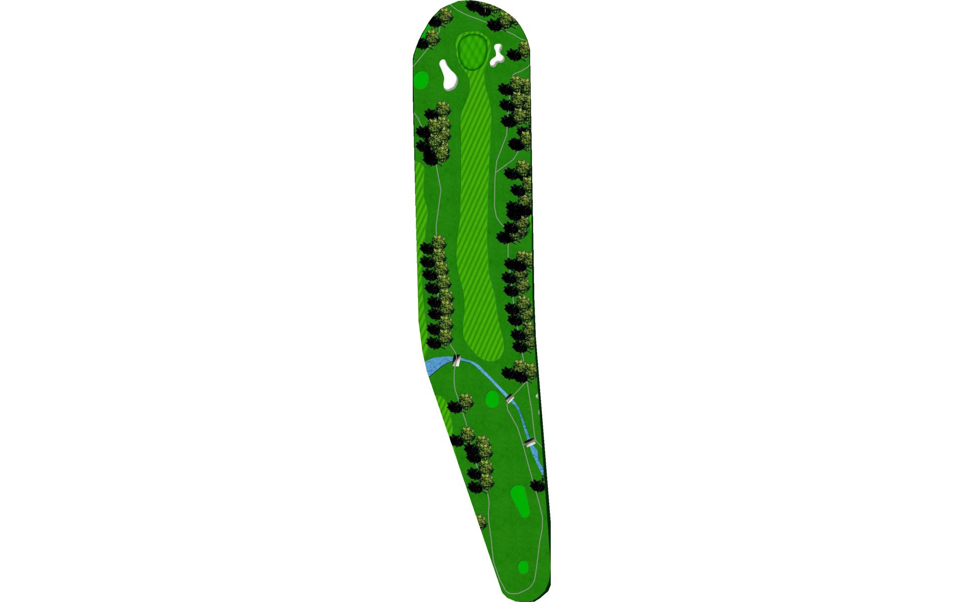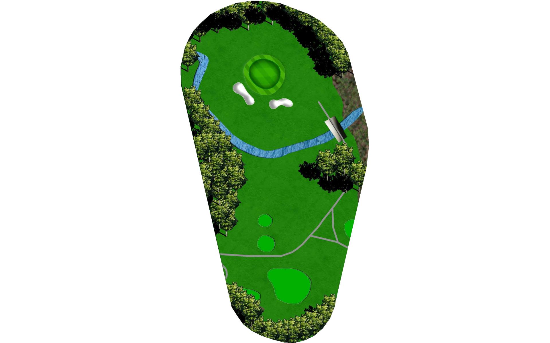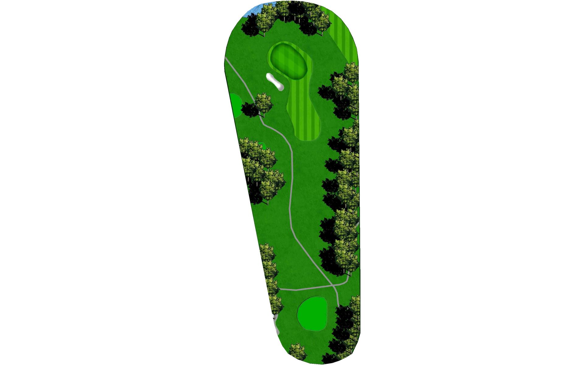 Difficult short hole that features a hazard down the left side and a challenging sloped back to front green. Stay below the hole.