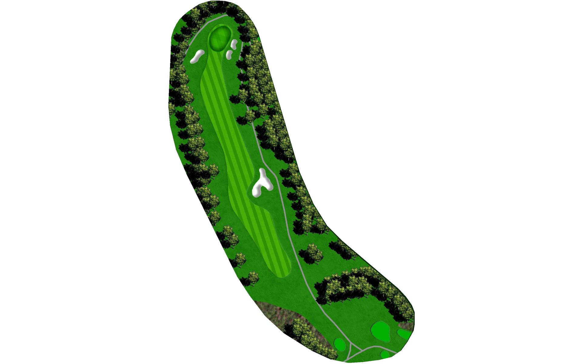 Sharpe right to left dogleg puts a premium on a good drive to allow you to go for green on your second shot. Big Hitters can gamble and hit over the trees and leave a pitch shot into the green. Tough green with back to front slope – stay below the hole!