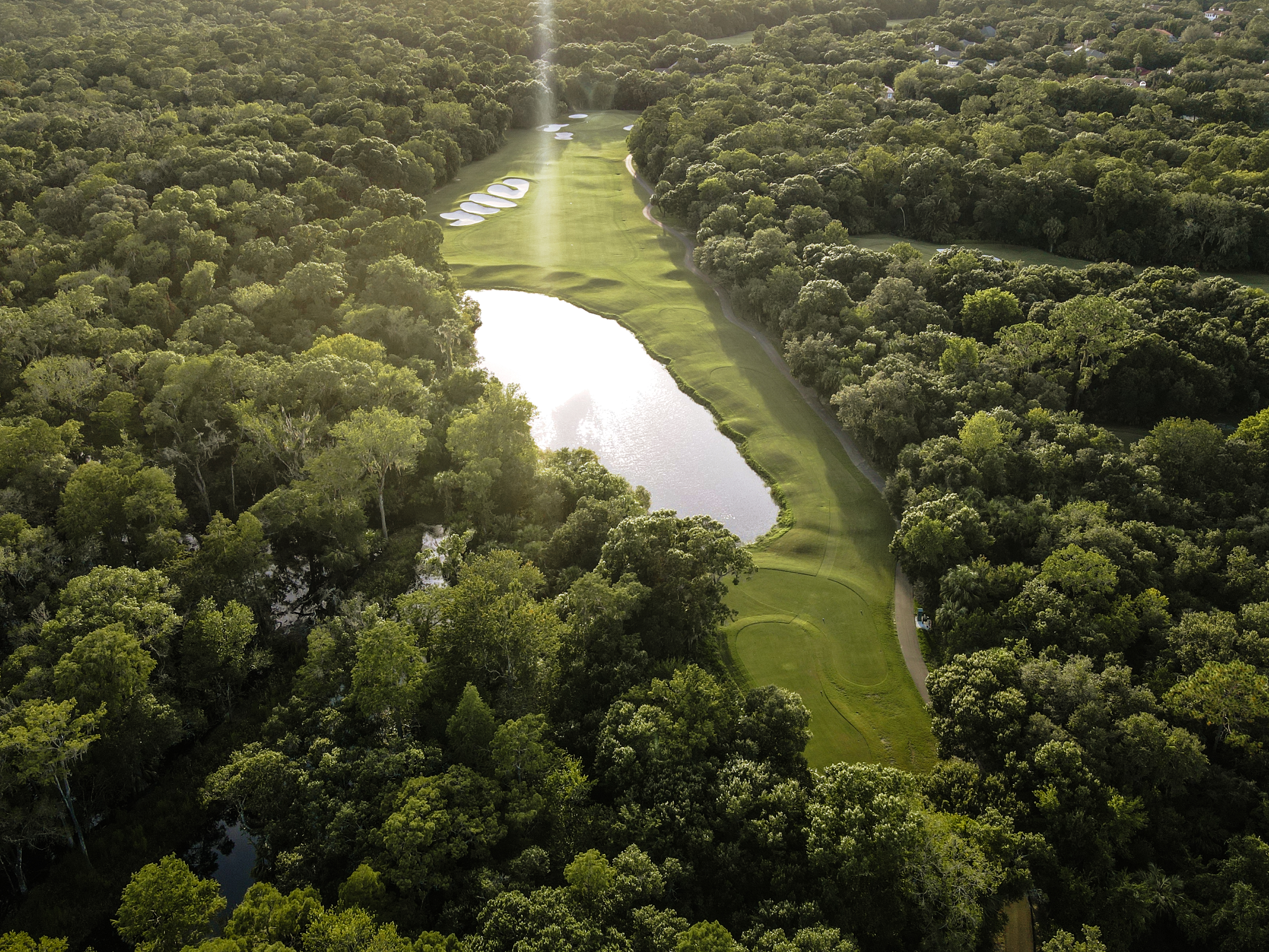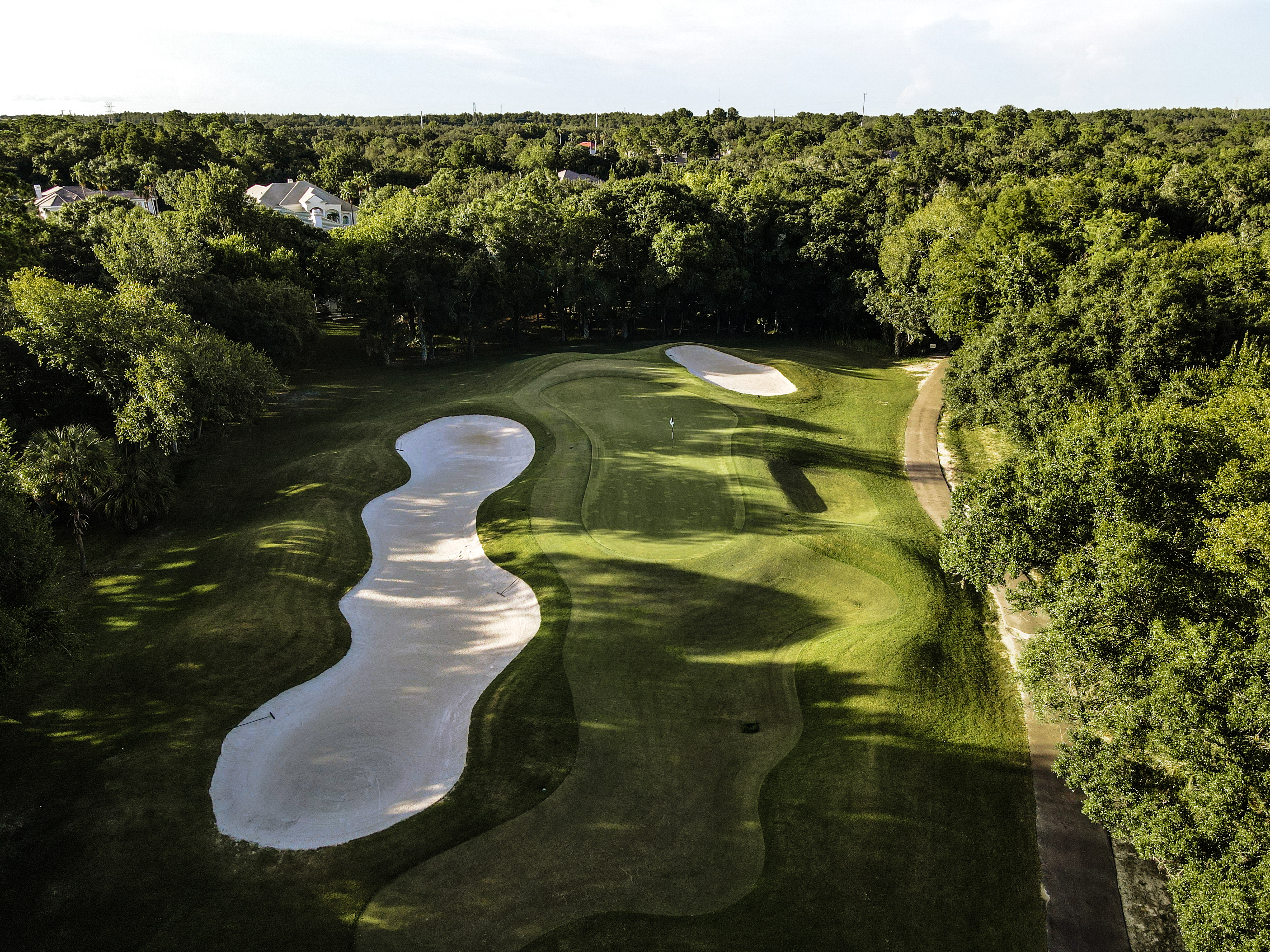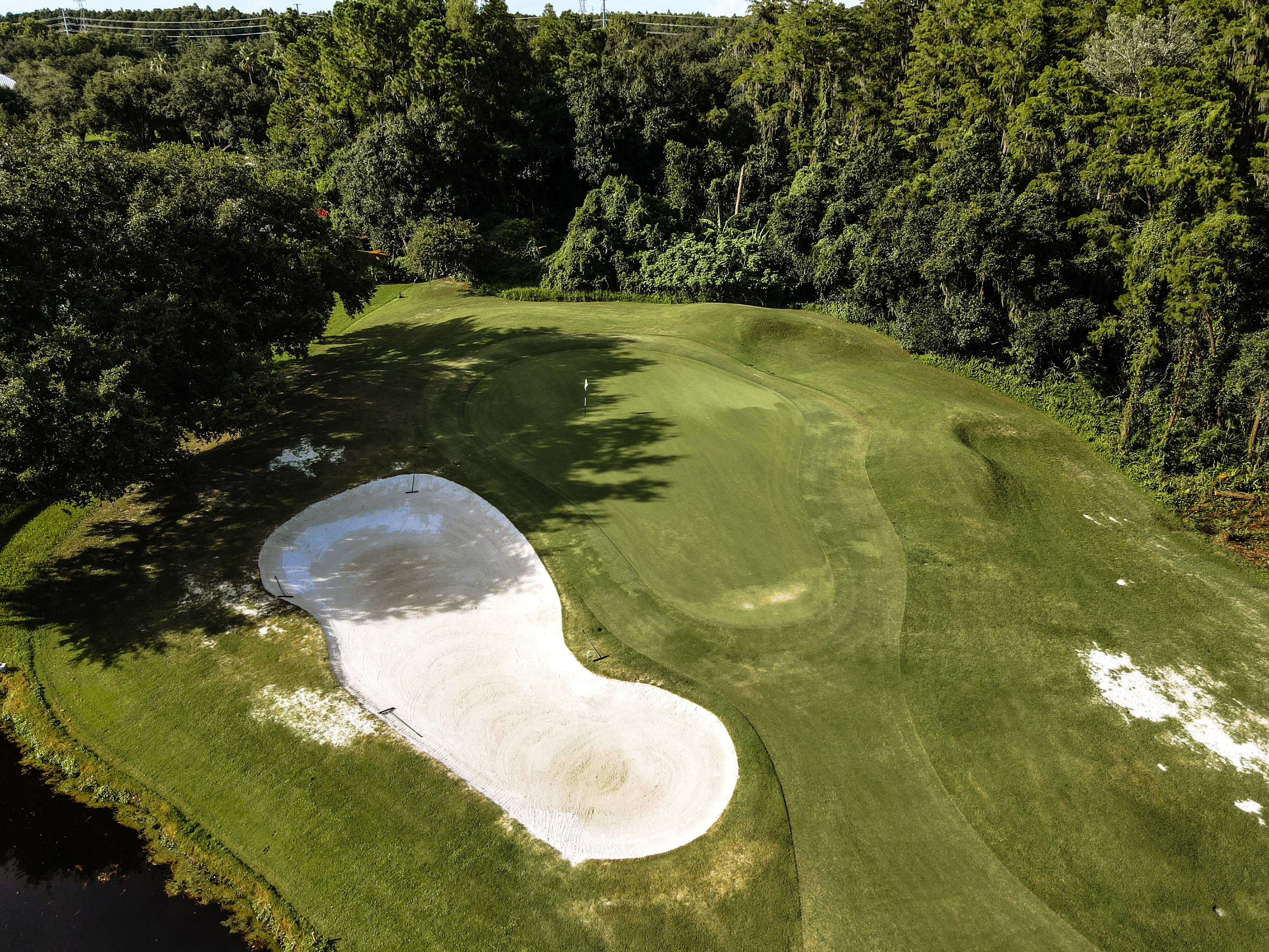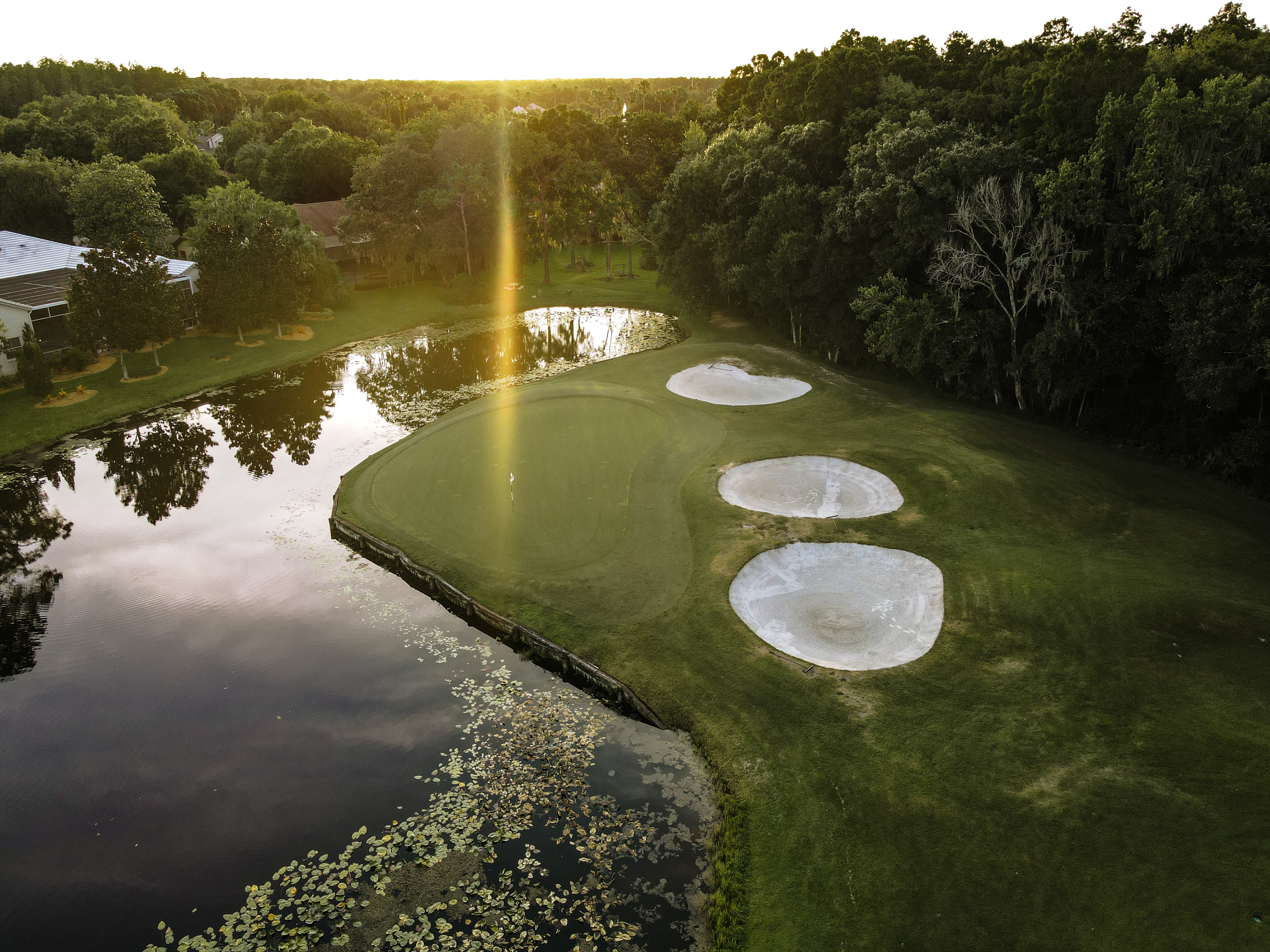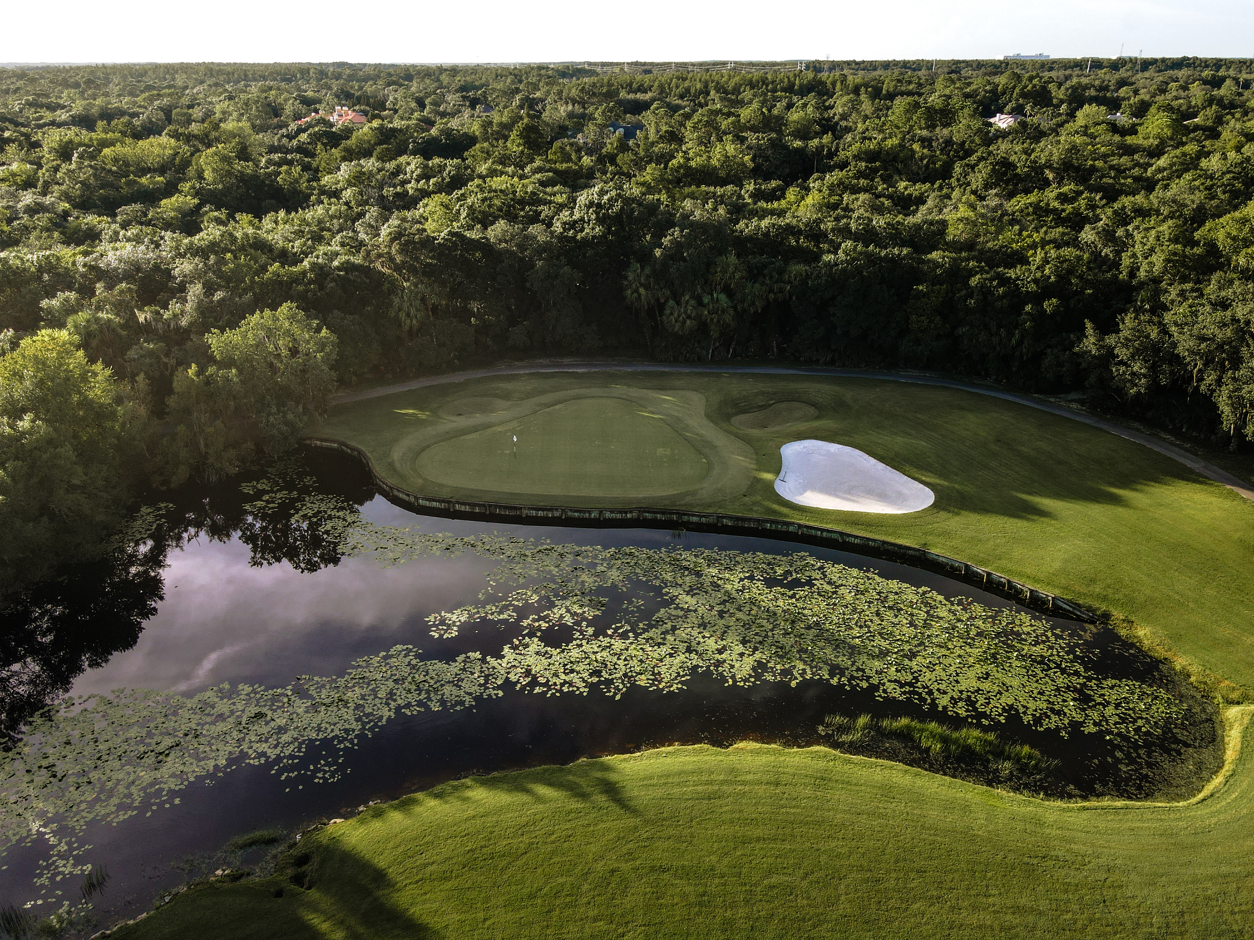 | Although not a long finishing hole, this hole requires two solid shots, both of which must navigate a lake. The lone fairway bunker is your aim point off of the tee. Pick a club to get it as close as you can to this bunker and you will have set yourself up for a short- to mid-iron into a severely sloped green protected by a bunker left and water everywhere else. The approach shot finishing above the hole here will leave you with a speedy downhill putt, so do your best to leave it below the hole. |