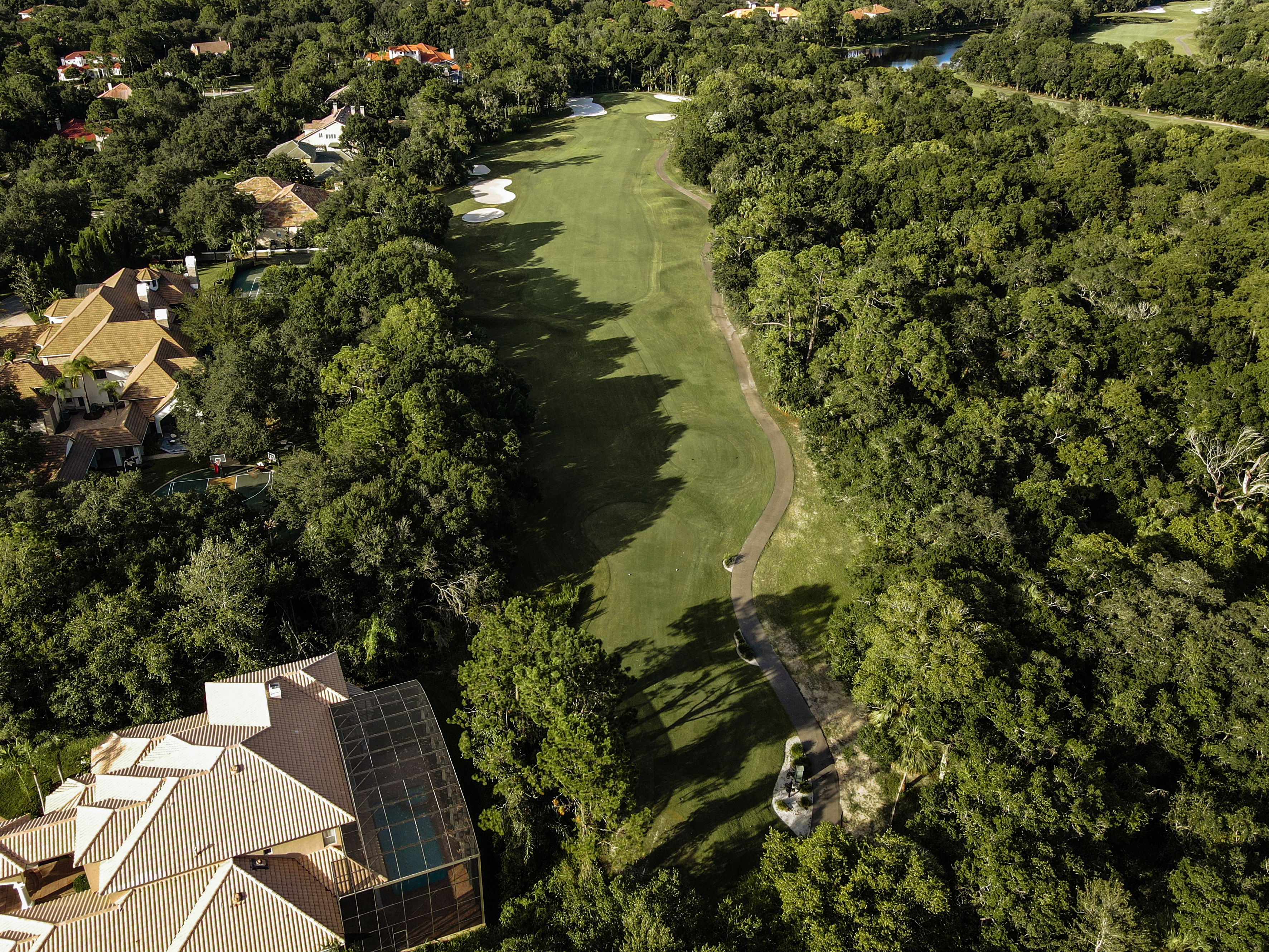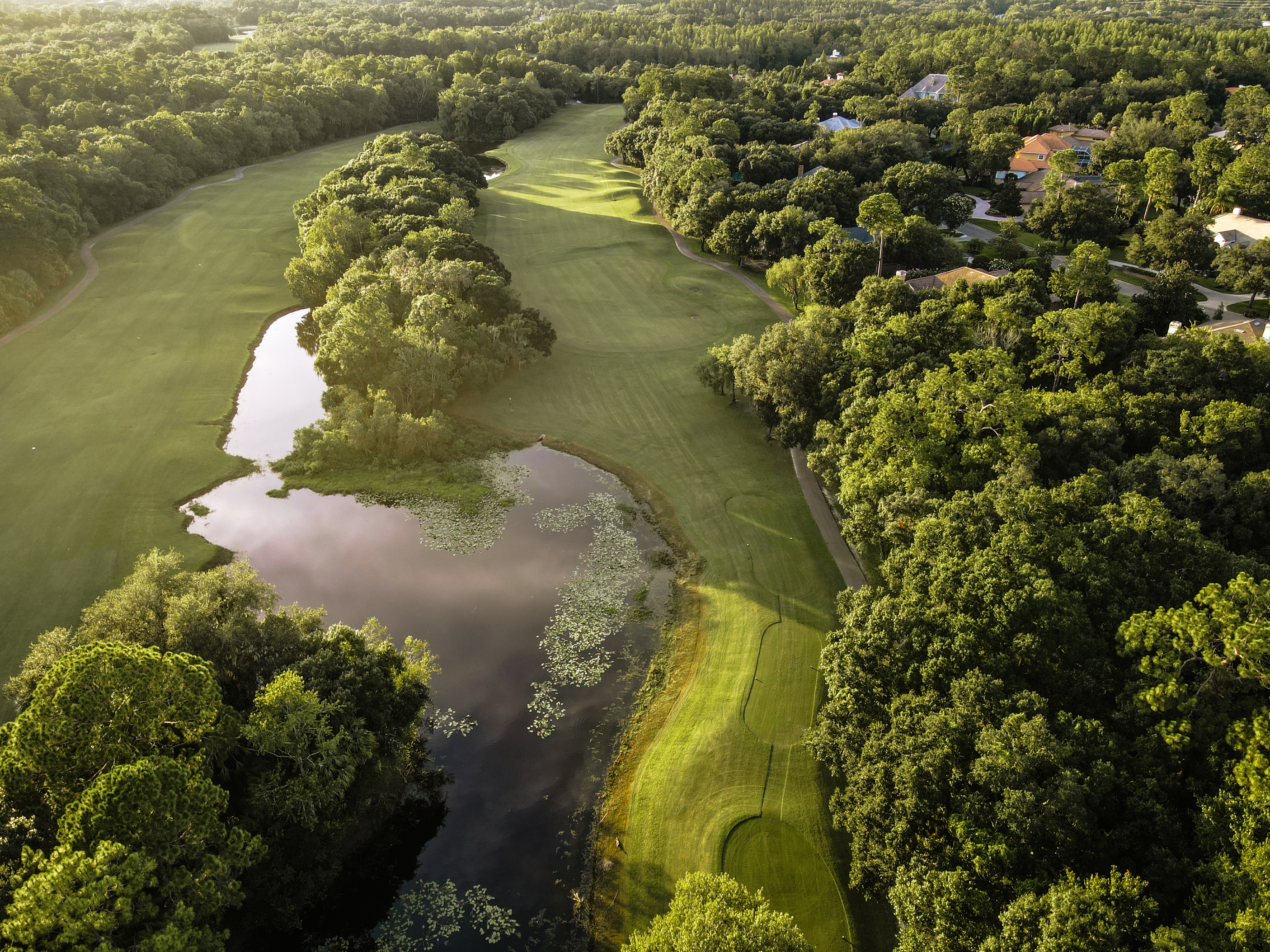 | A solid, long par 4 with a lake running the entire left side of the hole. A good tee shot to the right of the fairway will leave you a good angle to approach the green with a number of different options as the ball can be bounced in from that angle. The green is protected on both sides by bunkers. The best approach shot is short, allowing for a relatively easy chip to a long, narrow green. |