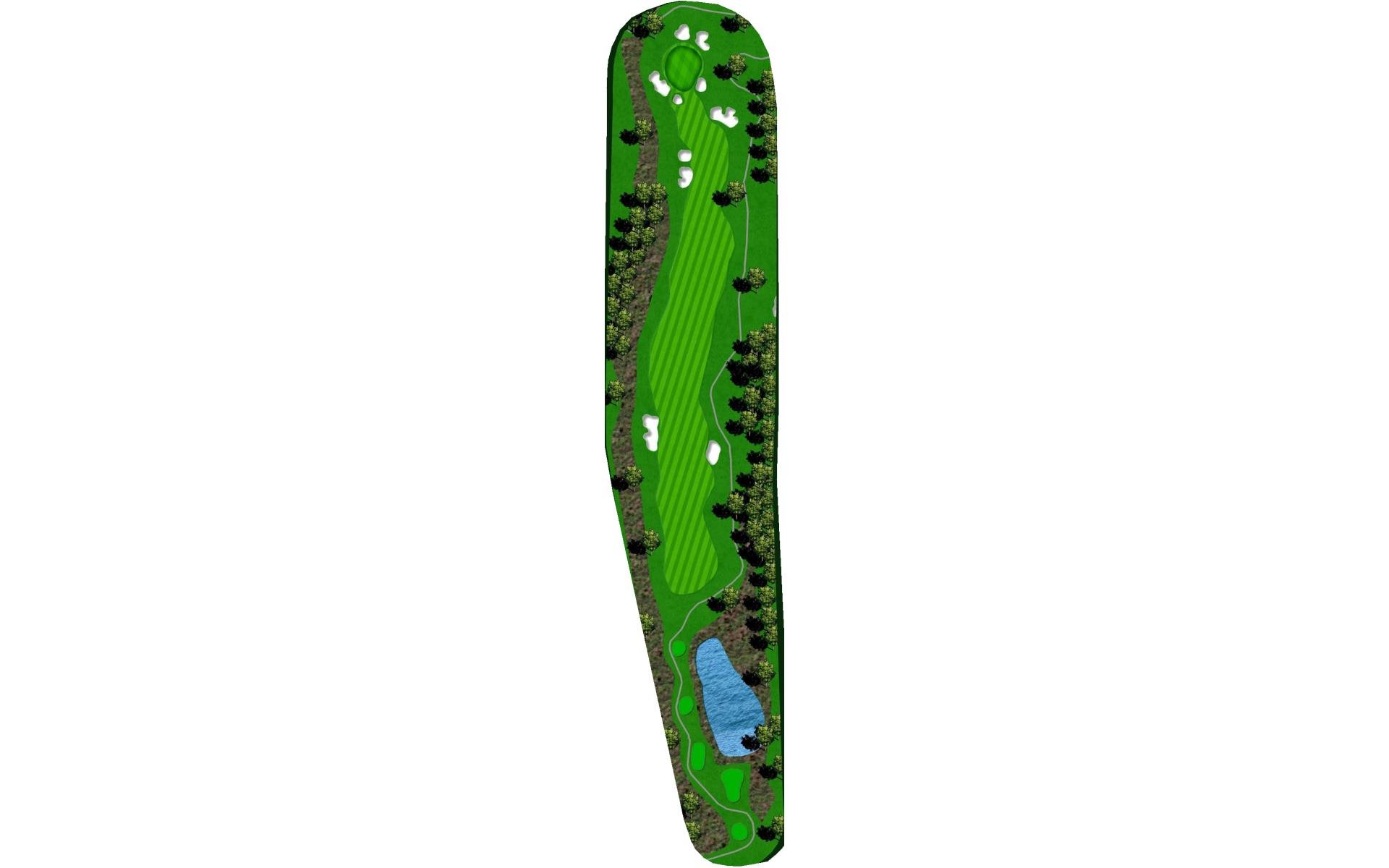The fairway on this par 4 slopes from left to right toward the lake. Stay left so your approach is not blocked by the trees on the right. …