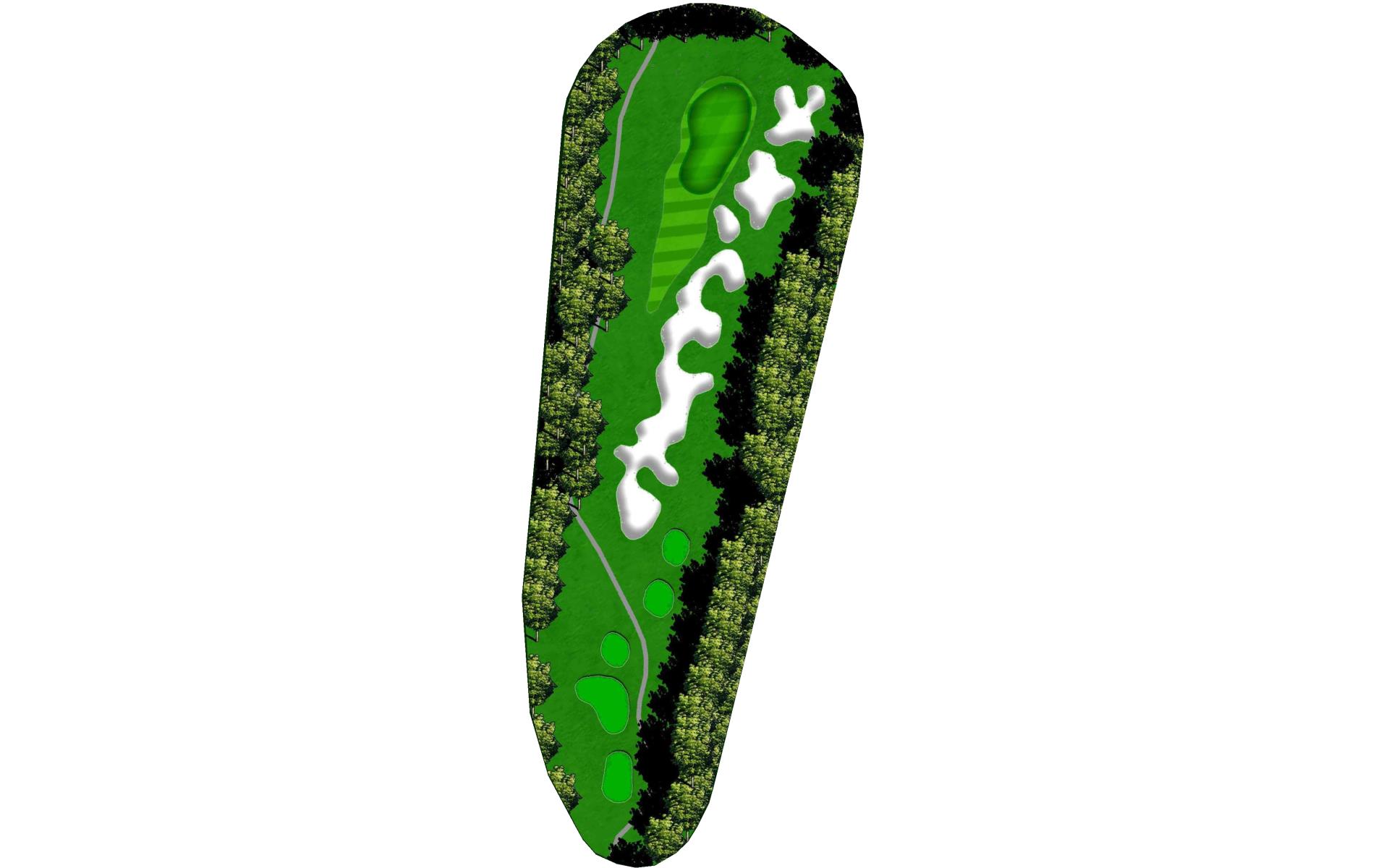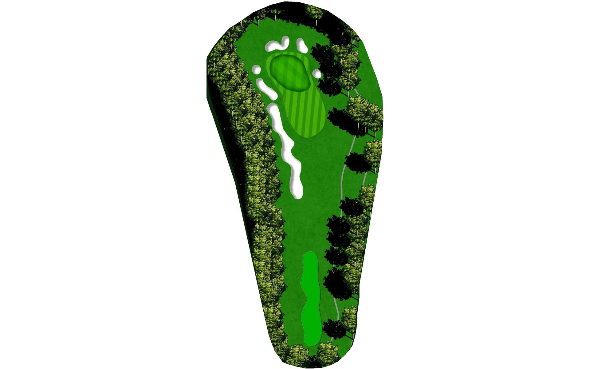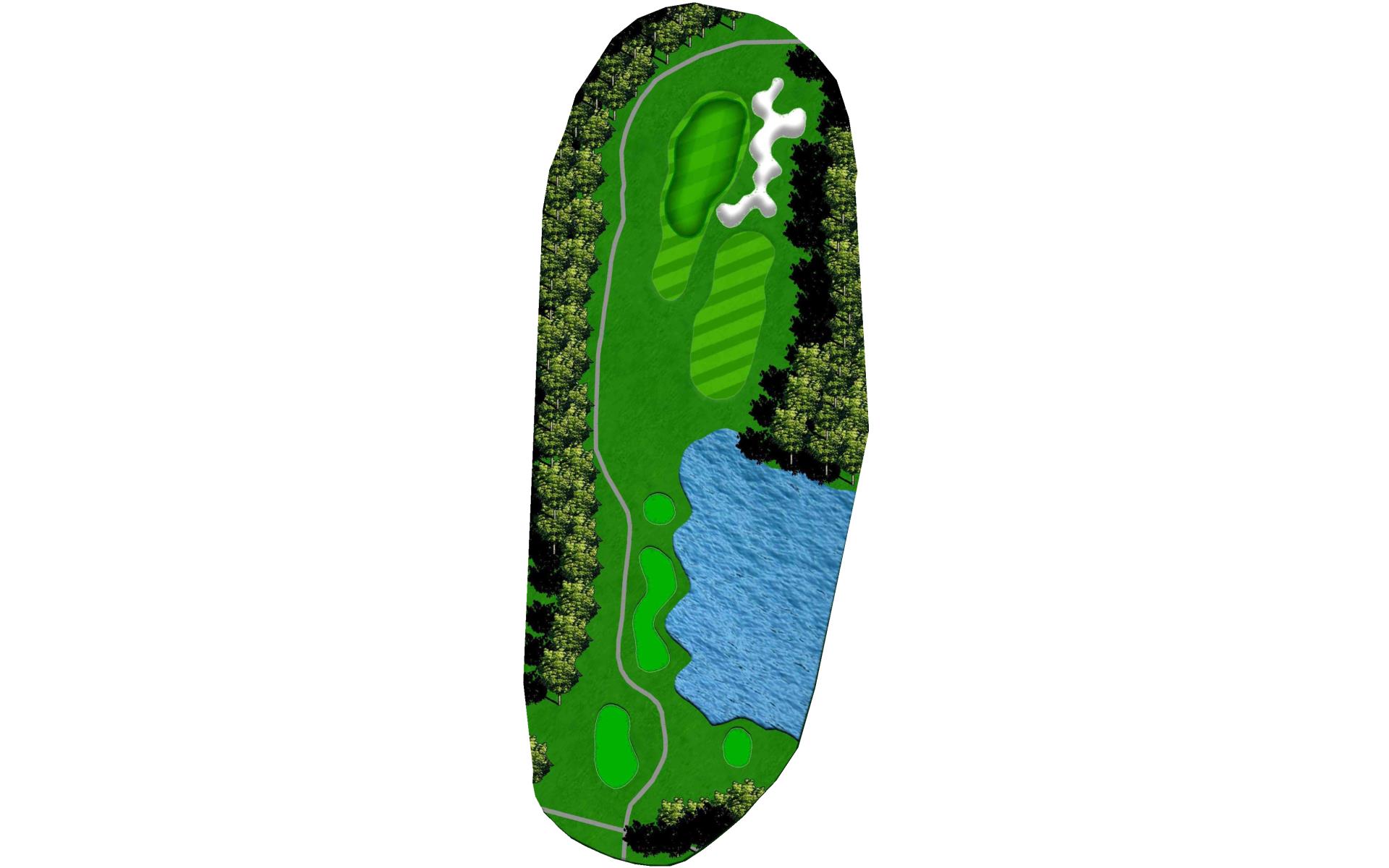 The opening hole is a short par 4 that requires players to hit a blind tee shot over a ridge. Finding the fairway is crucial as it will set up a birdie opportunity. When hitting the approach shot, players must be careful to avoid the pond along the left side of this green that runs away.