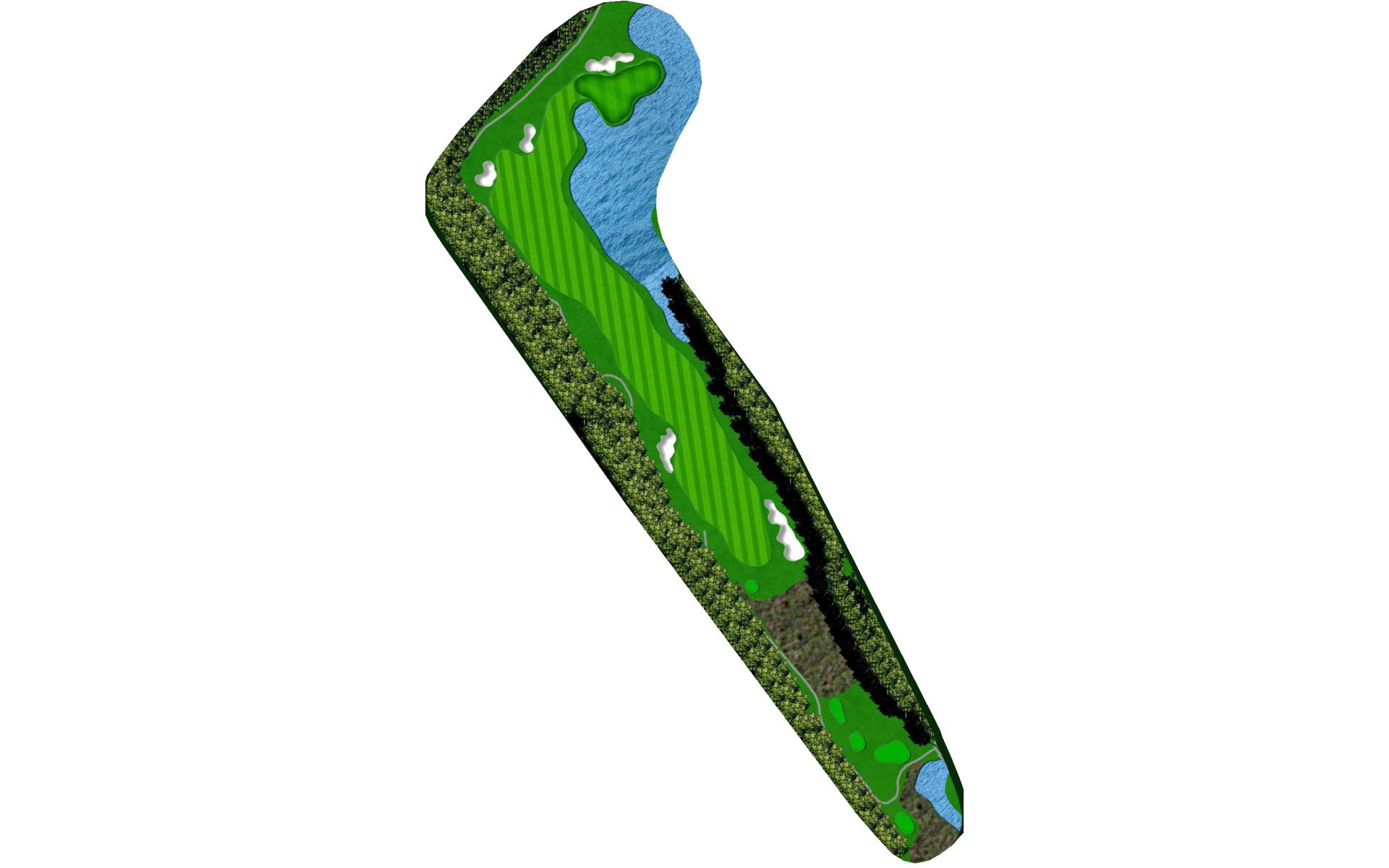 The finishing hole is a par 5 that requires players to hit the fairway if they want to go for the green in two. Rolling terrain slopes towards the water down the right side of the hole. This green is surrounded on three sides by water and the fourth by a bunker.