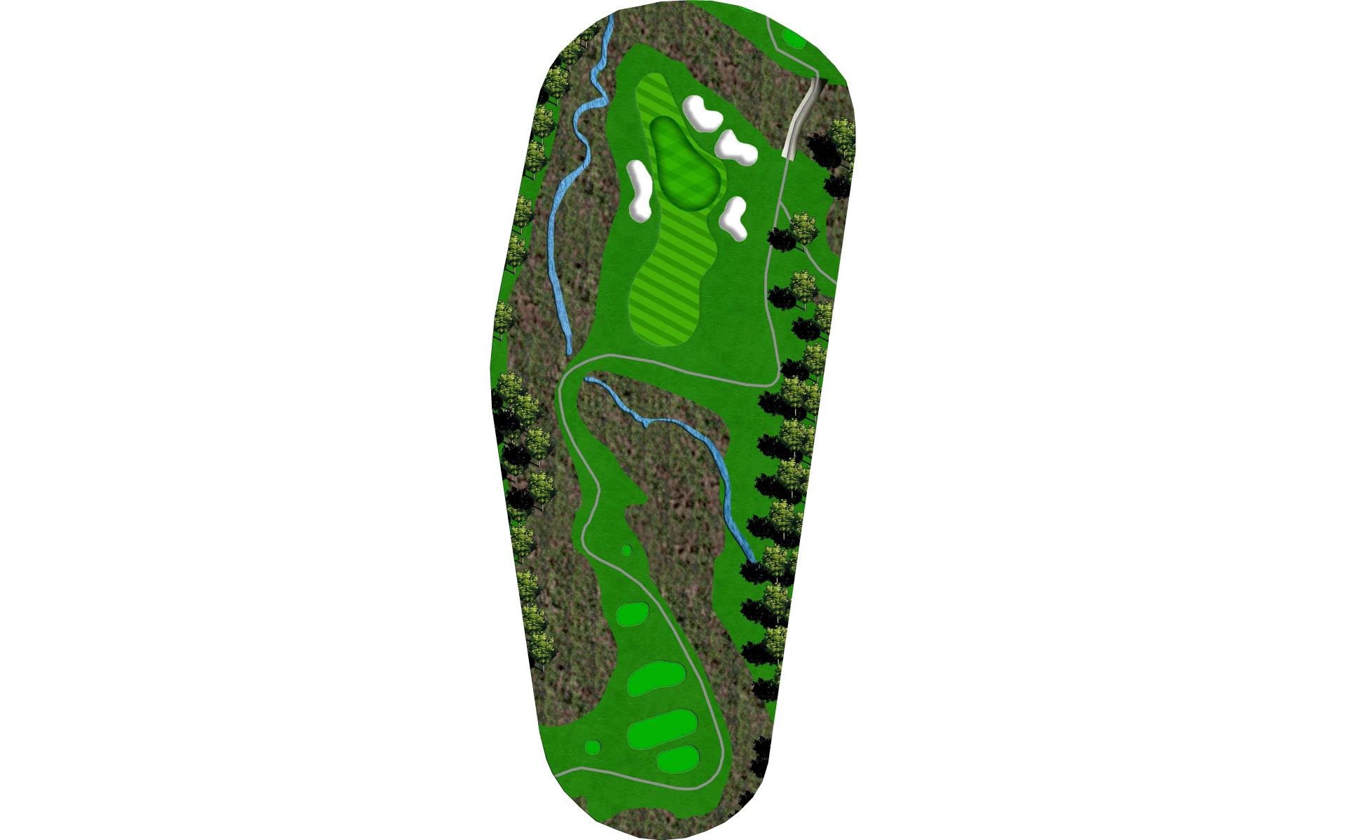 This long Par 4 traverses 80 feet downhill but still demands two solid shots to reach the green. All the tees look down on the landing area with wetlands on the left and a large fairway bunker to the right. The ideal tee shot challenges the bunker and hillside on the right to keep from rolling into the wetland on the left. The second shot is played over a wetland peninsula to a green cut into the existing hillside with bunkers on the left to keep balls from running down the hill into the wetland. This is one of the toughest holes on the course.