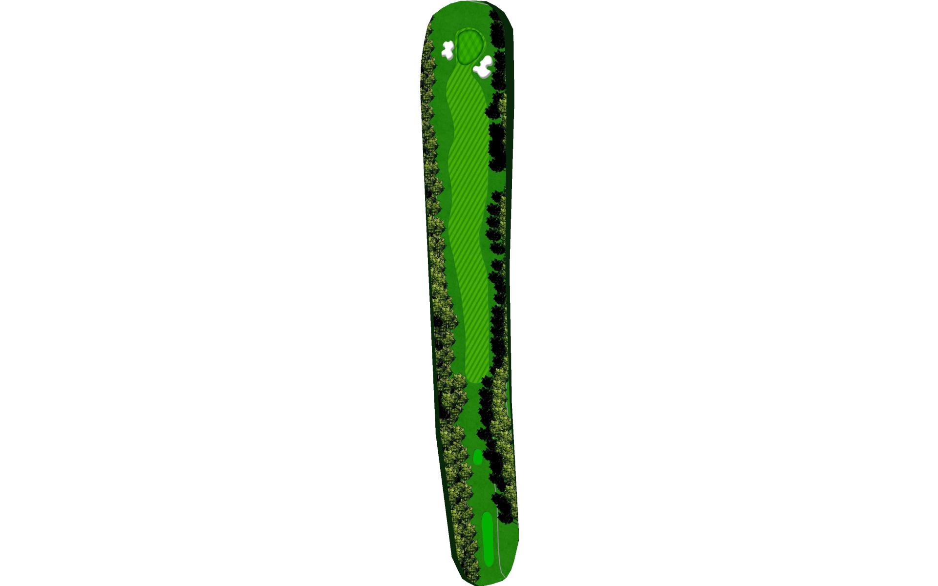| A tough driving hole. Favor the right side and keep ball below the pin on the green. |